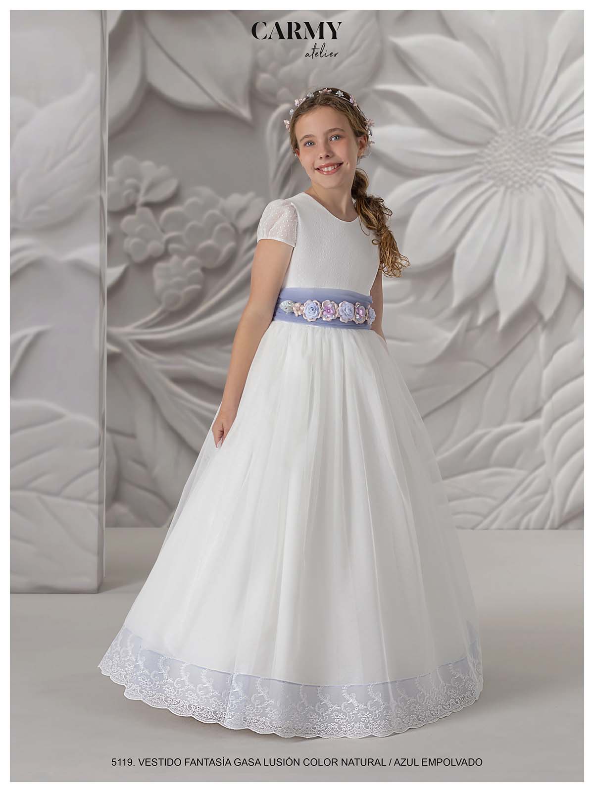 This beautiful communion dress is made of delicate illusion chiffon and powder blue tulle. It features a rounded neckline at the front and an elegant V-back. The short sleeves add a delicate touch, while the belt adorned with a strip of flowers highlights the waist. The back is completed with a charming bow, perfect for a special day.