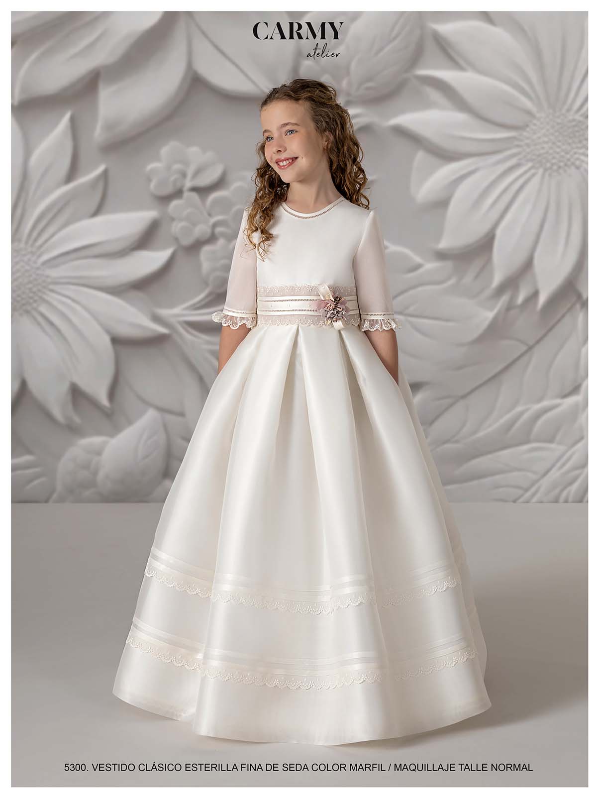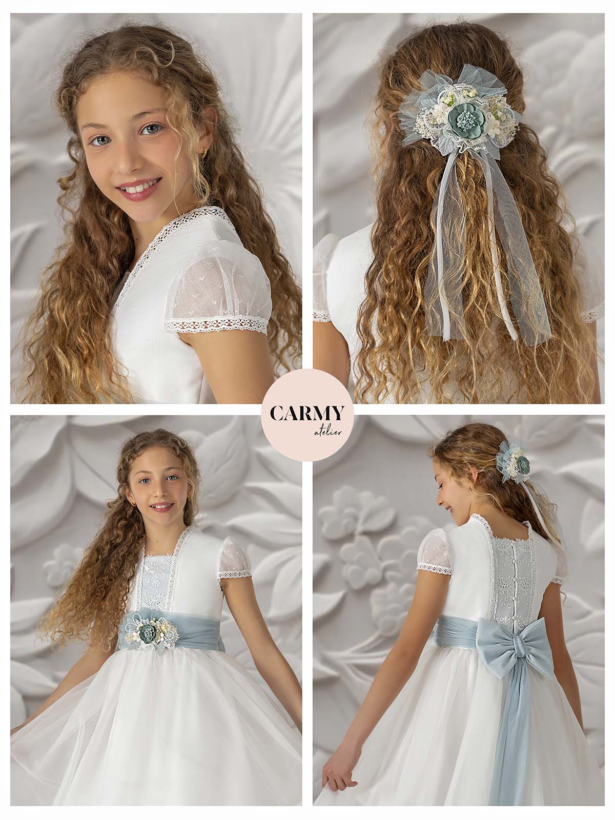 The Fantasia communion dress is a work of art in illusion chiffon. It features an elegant bodice with a high neck, enhanced by delicate lace and subtle touches of powder green tulle. A tulle belt complements the design, adorned with charming flowers that add a touch of freshness and romanticism, ideal for such a special day.