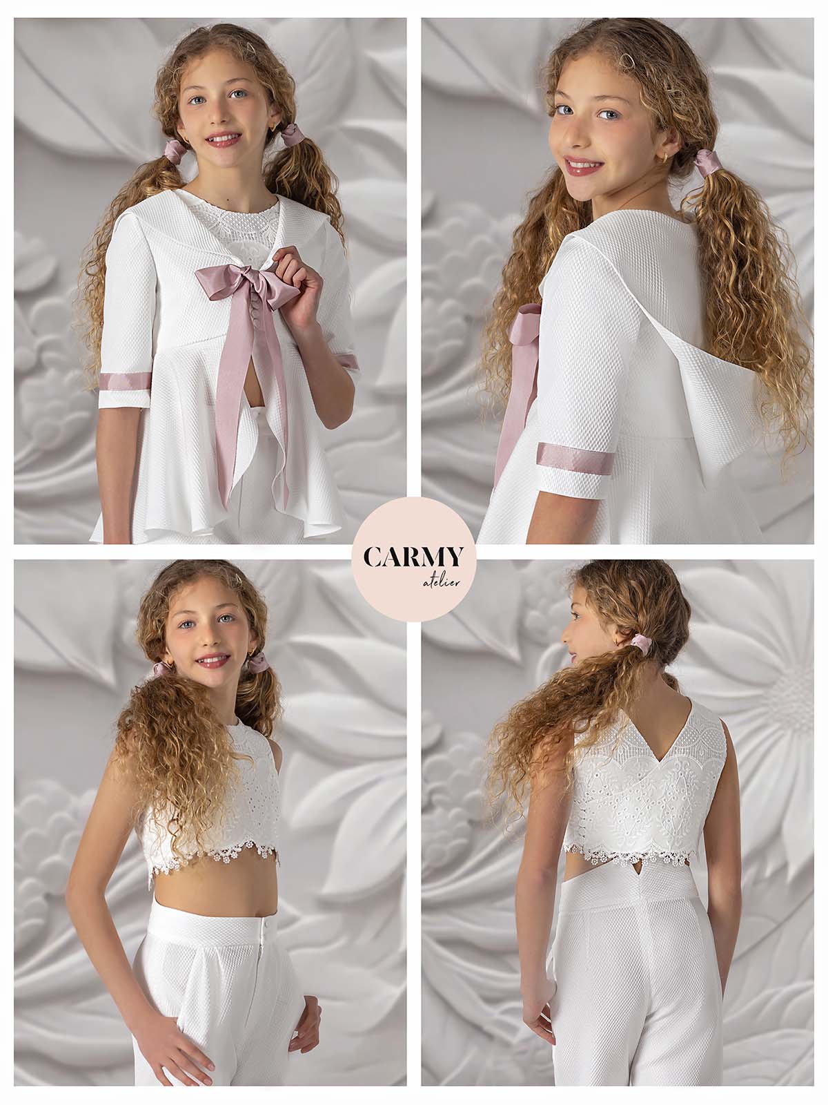 This set consists of pants and an embroidered top matched with a brocade jacket. The jacket has three-quarter sleeves, with a large bow on the front in a makeup color, which provides a touch of color and femininity. The jacket also features details on the cuffs in the same color, perfectly complementing the set.