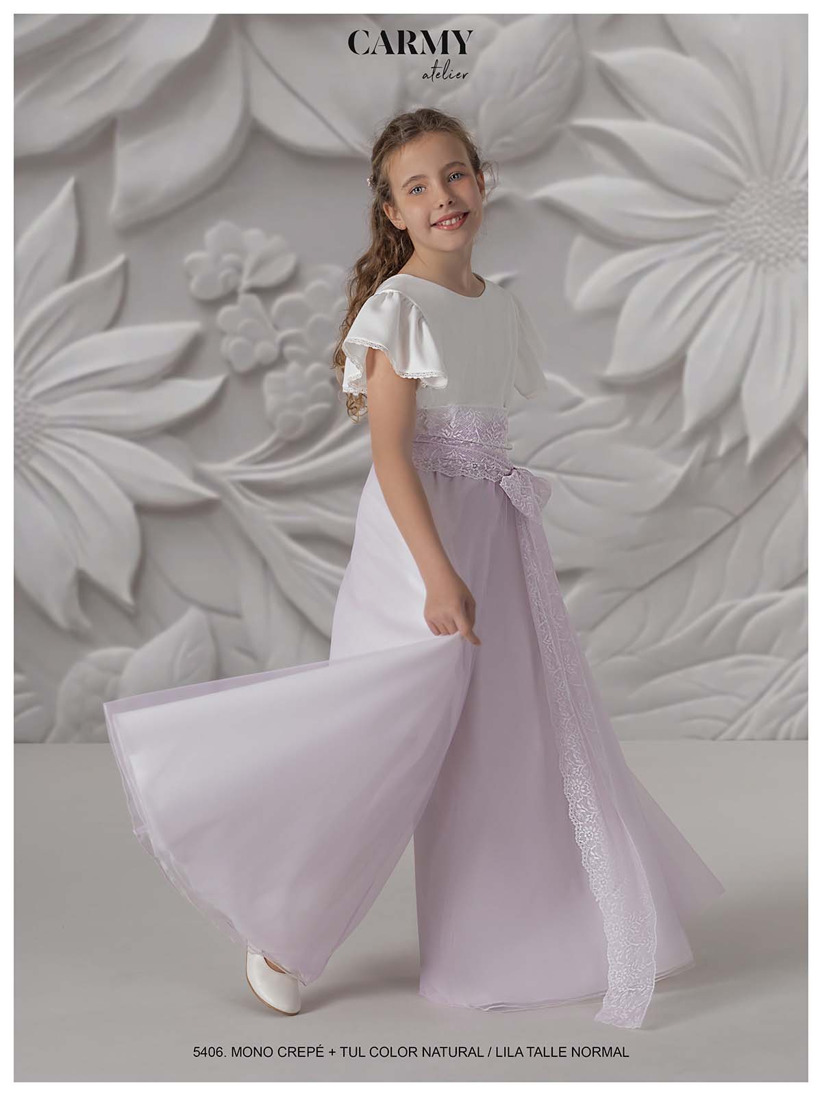 Discover the sophistication of the communion jumpsuit made of crepe, natural-color tulle and a delicate lilac tone. The top features a simple design with short sleeves that are finished with lace, adding an elegant touch. The bottom is wide and fluid, allowing comfortable movement. The waist is adorned with a belt of the same color that complements the aesthetics of the dress, ideal for special occasions.