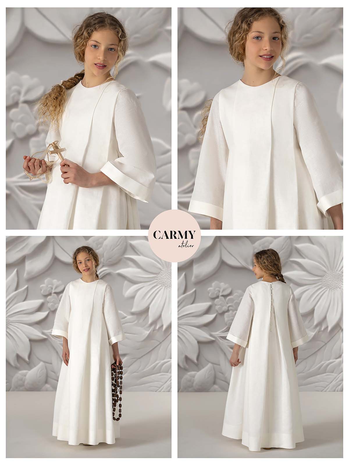 This communion tunic is made of linen in an ivory tone, which provides a fresh and light air. It has a spacious and comfortable design, with flared sleeves that enhance its elegance. The texture of the linen gives it a more rustic and organic look.