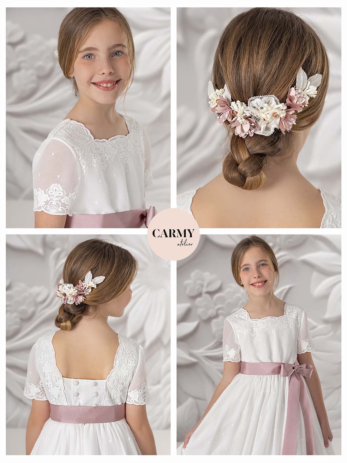 Romantic communion dress made of embroidered bambula. The natural colors and makeup create a delicate and elegant combination. With a short waist, this dress is perfect for girls looking for a fresh and modern look without losing tradition. The embroidered bambula provides a handmade and sophisticated touch, ensuring that each girl feels special and comfortable on her communion day, standing out with grace and style.