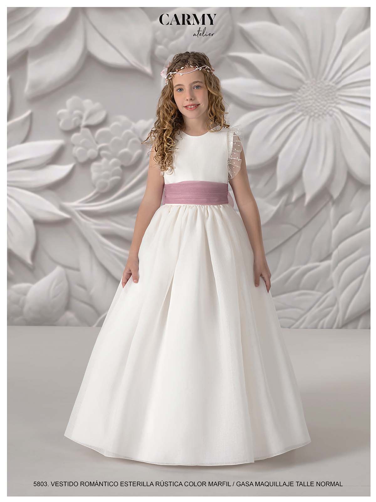 Romantic communion dress made of rustic mat. Ivory and ocean blue colors evoke serenity and elegance, creating a fresh and sophisticated look. This regular-waisted dress is ideal for girls who want a classic look with a distinctive touch. The quality of the materials and the detailed design ensure that each girl feels special and comfortable on her communion day, standing out with grace and style.