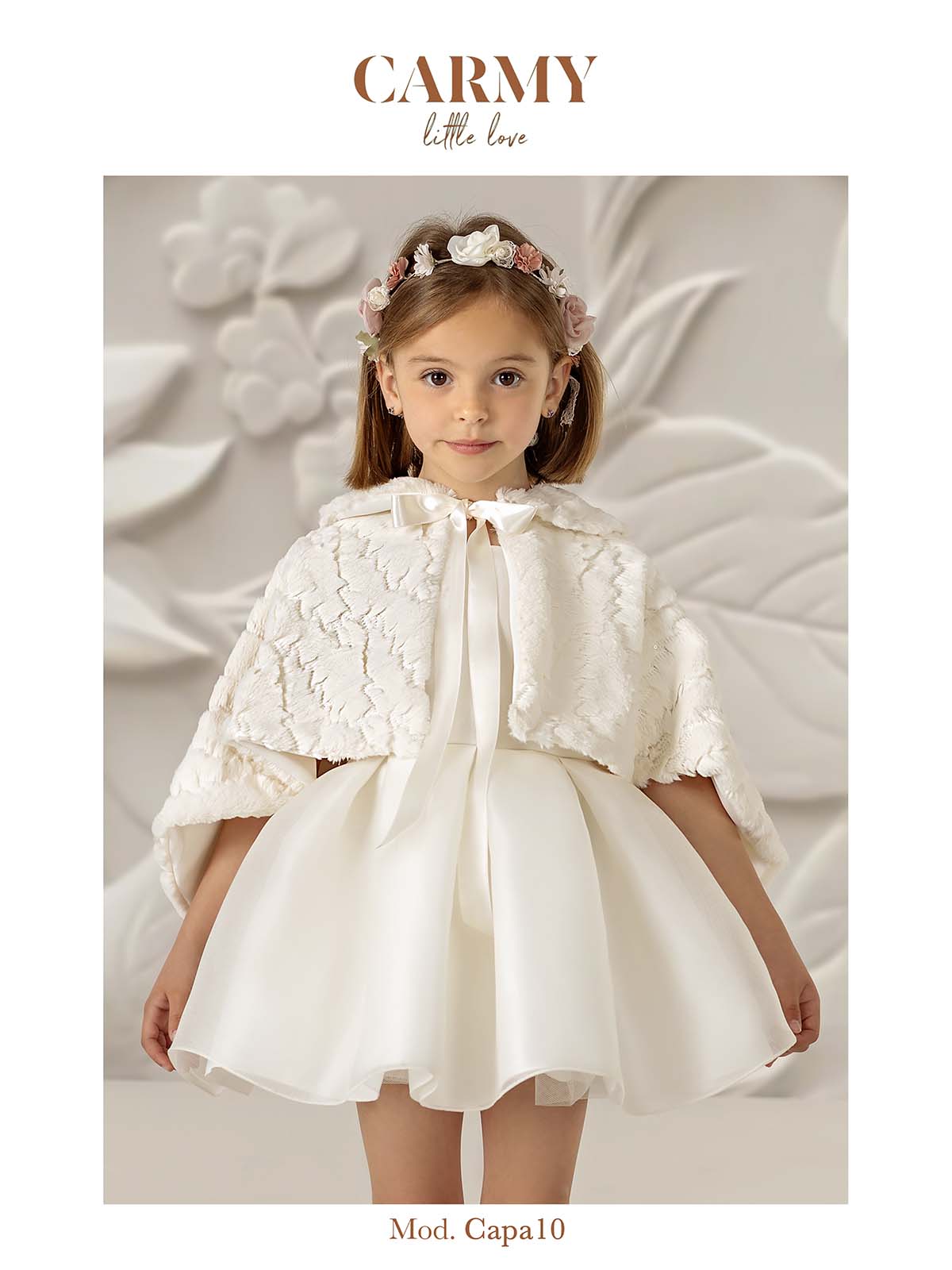 Capa de ceremonia para niña, elaborada en suave terciopelo marfil, que irradia elegancia.