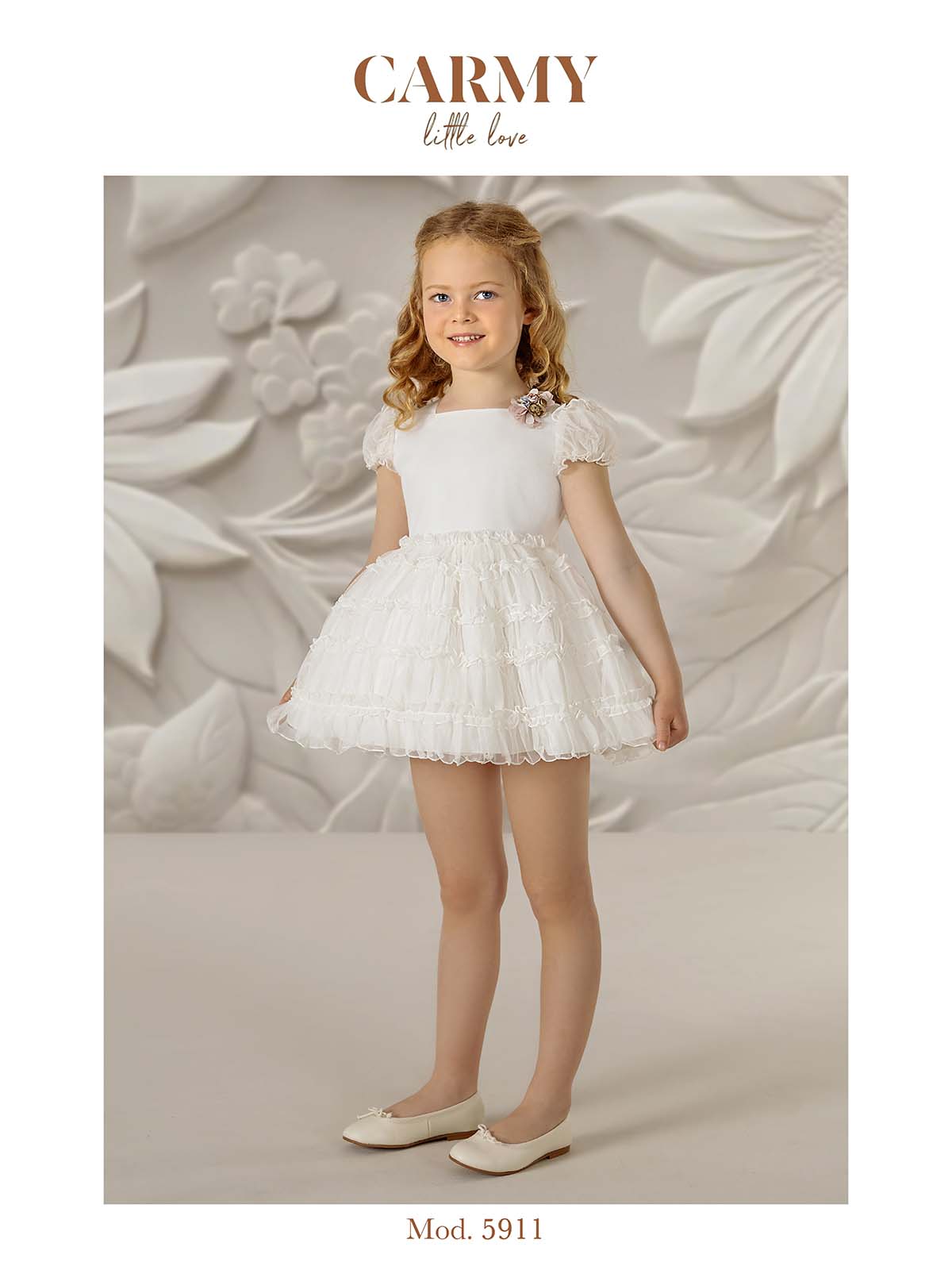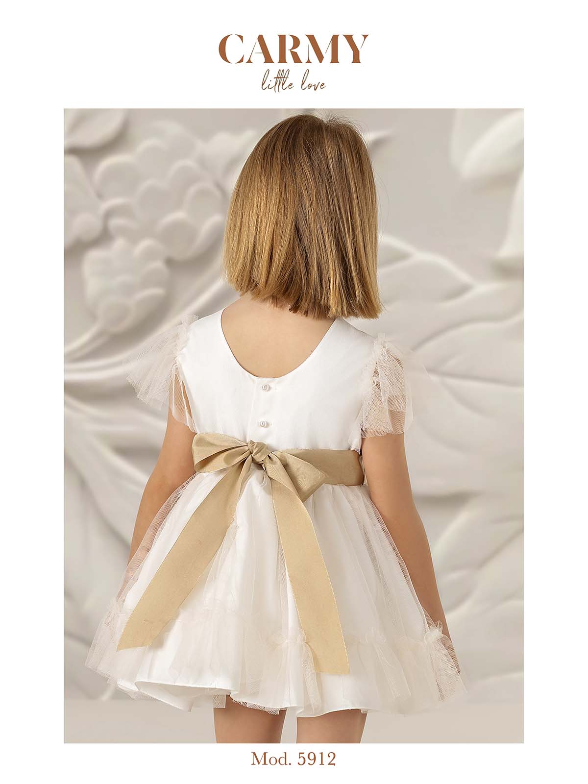 Elegante vestido de ceremonia confeccionado en suave tul salmón, que deslumbra con su delicada caída. El diseño se complementa con un cinturón marrón dorado, adornado con delicadas flores que añaden un toque de sofisticación. Ideal para ocasiones especiales, este vestido irradia frescura y romanticismo, realzando la belleza de quien lo lleva.