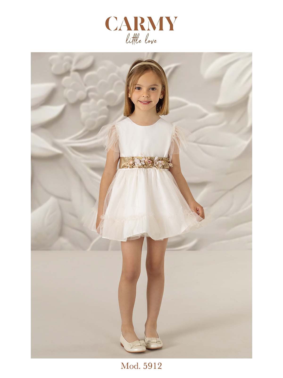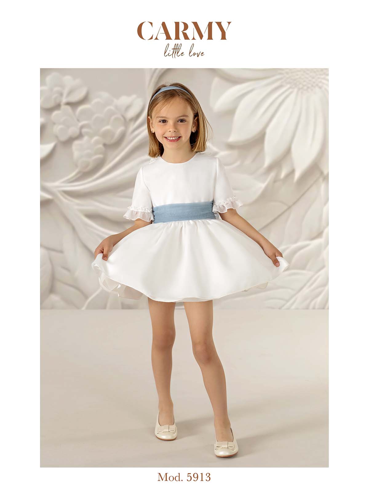 El vestido de ceremonia en color natural destaca por su elegancia y sofisticación. Sus volantes delicados adornan las mangas y la espalda, aportando un toque romántico. Un cinturón de tul en azul océano realza la figura y añade un contraste vibrante, creando una silueta única y encantadora para cualquier ocasión especial.