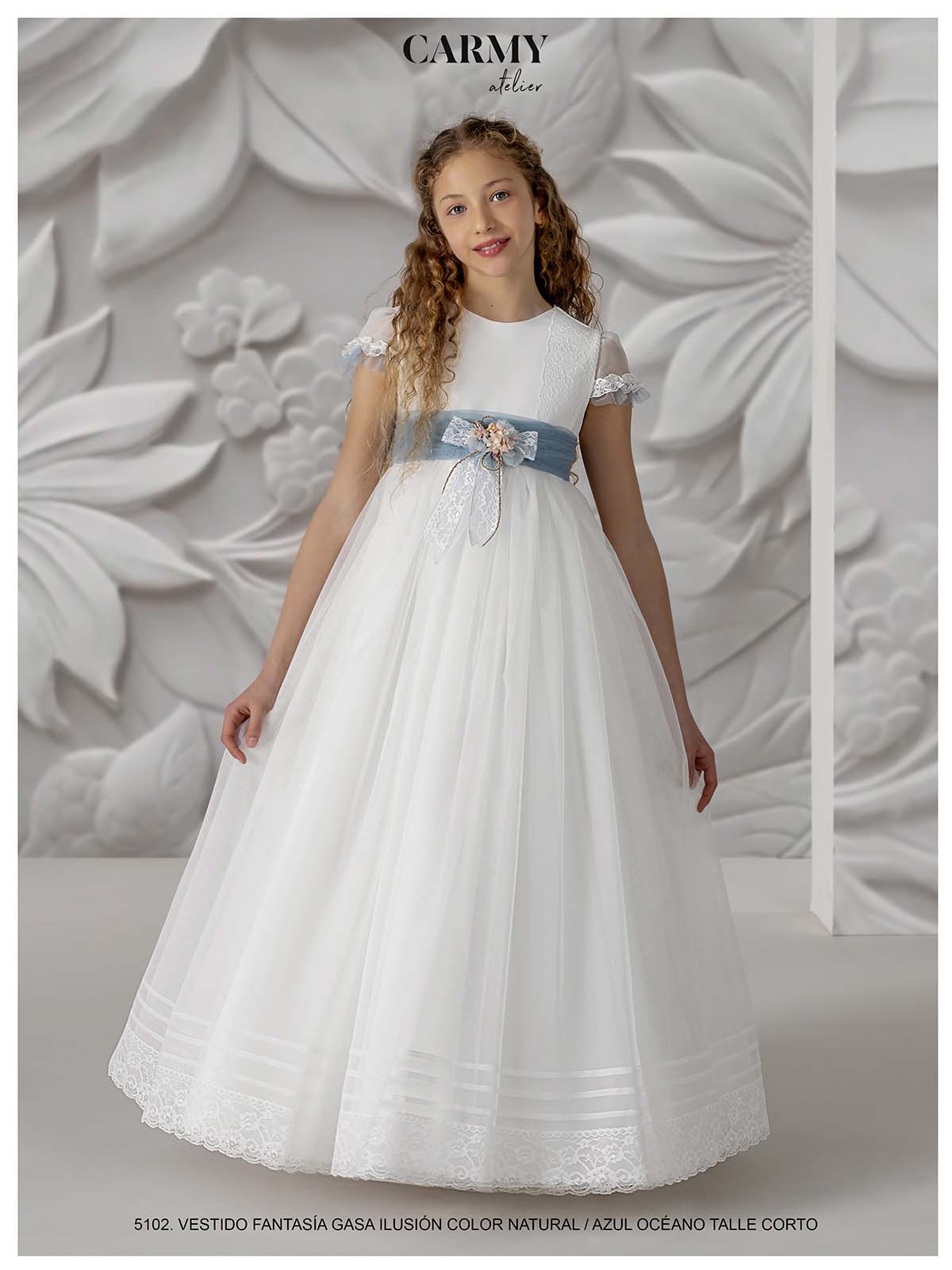 Este vestido de comunión estilo romántico destaca por su delicado tejido de organza de plumeti, que aporta un aire etéreo. La combinación con tul azul océano añade un toque de sofisticación. Su espectacular espalda, terminada en suaves ondas, realza la silueta, mientras que un delicado adorno de flores en la cintura aporta un encantador detalle, ideal para un día tan especial.