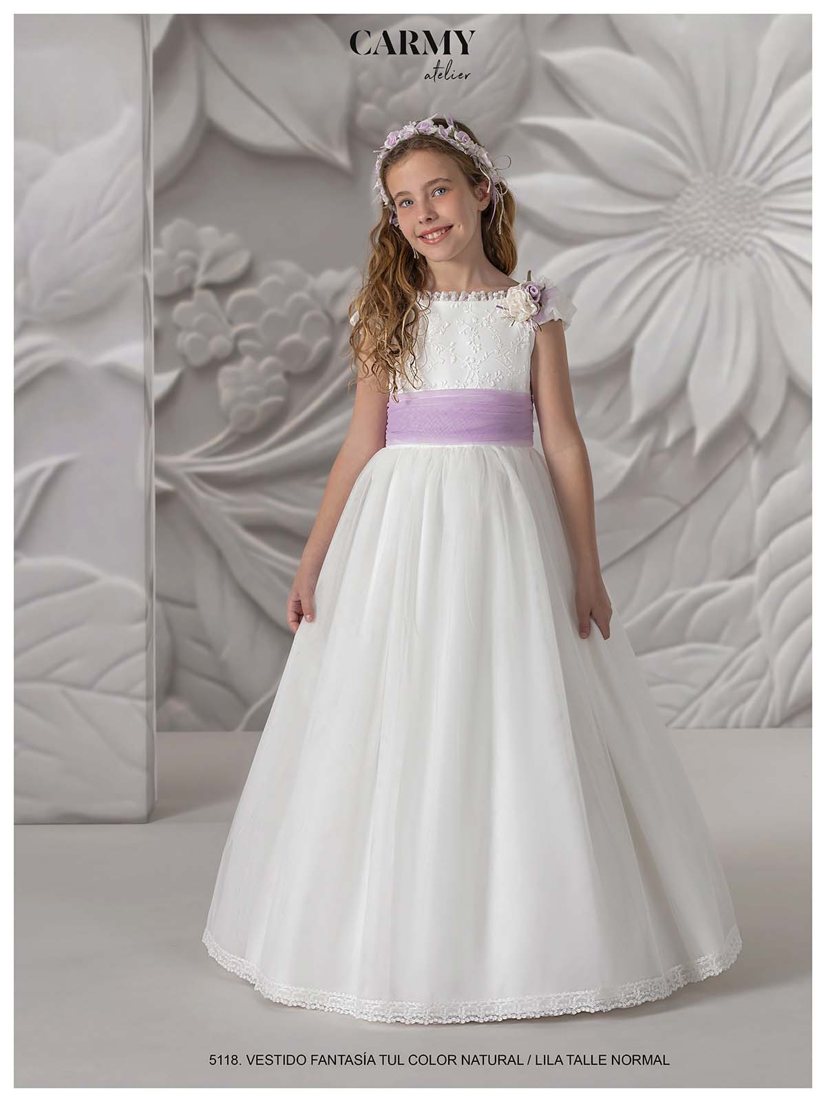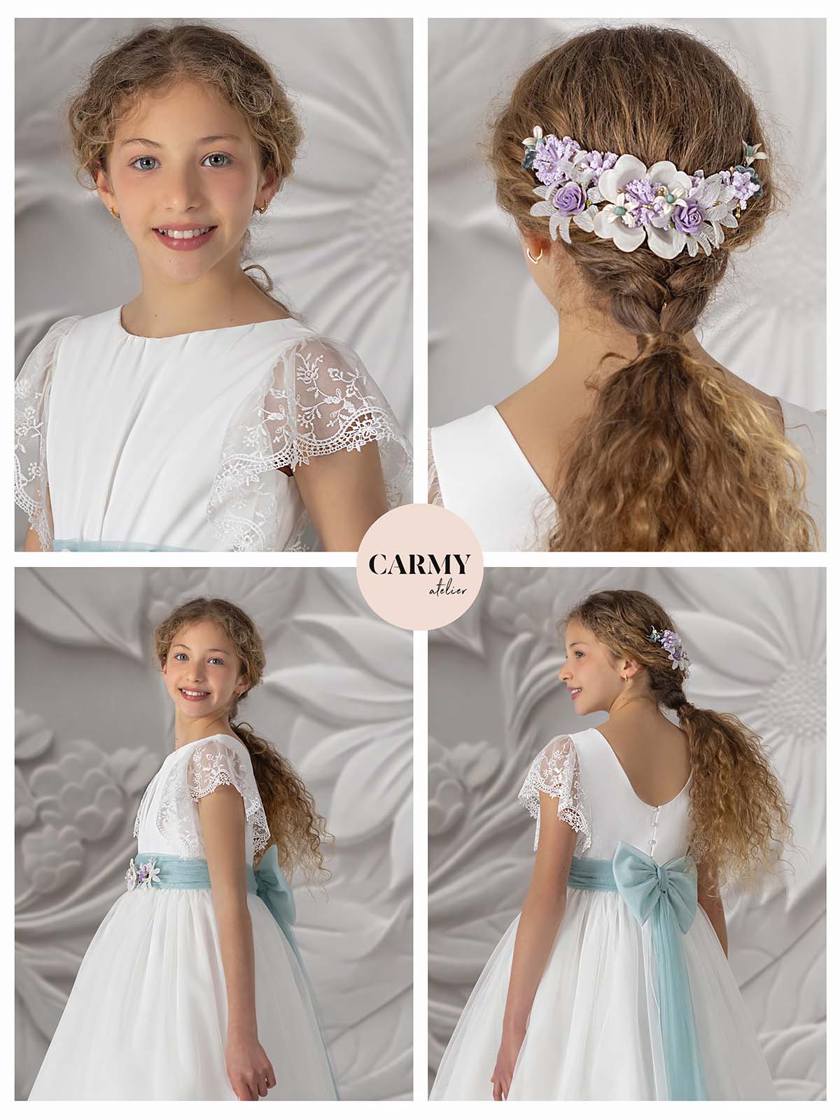 Este hermoso vestido de comunión de fantasía presenta un cuerpo de crepé que se adorna con delicados pliegues, aportando elegancia y suavidad. La falda, confeccionada en etéreo tul color natural, se complementa con encantadores detalles en tul verde menta. Un cinturón con adorno floral realza la cintura y un elegante lazo en la espalda añade un toque de romance y sofisticación.