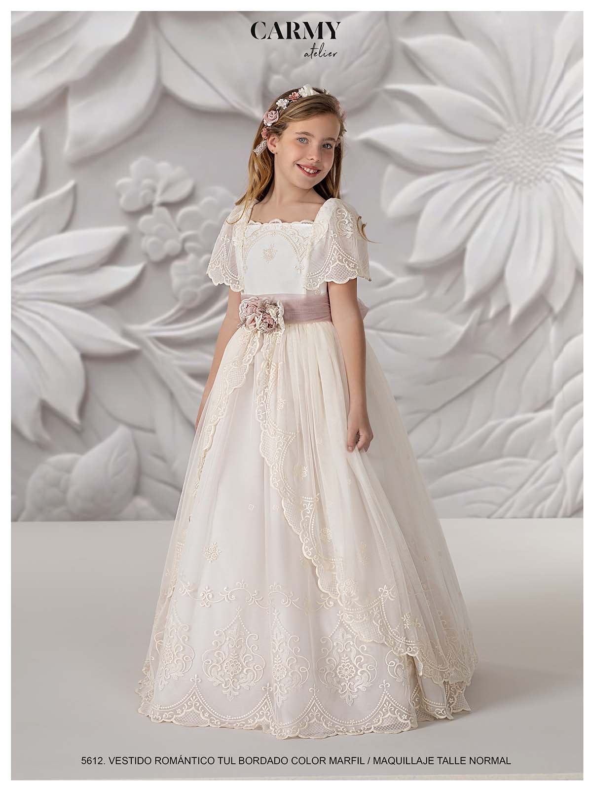 Este encantador vestido de comunión romántico está confeccionado en delicado tul bordado marfil, realzado con detalles en tul maquillaje. Su diseño presenta un elegante escote cuadrado y mangas anchas que añaden un toque de sofisticación. La falda con abertura delantera proporciona un aire de modernidad, mientras que el cinturón decorado con flores resalta la cintura, ofreciendo un acabado dulce y mágico.