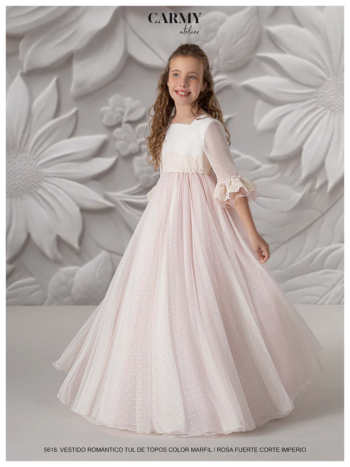 Este encantador vestido de comunión en tul de topos marfil evoca un aire romántico y delicado.