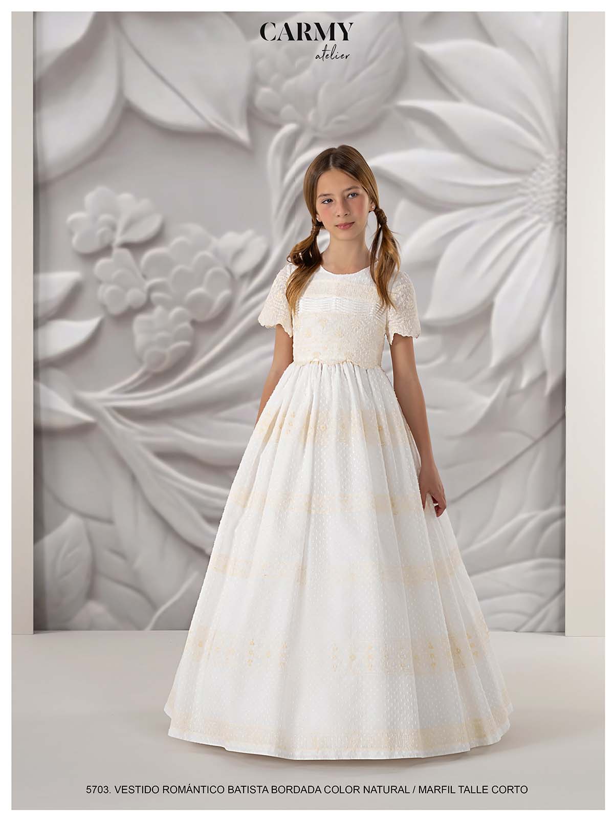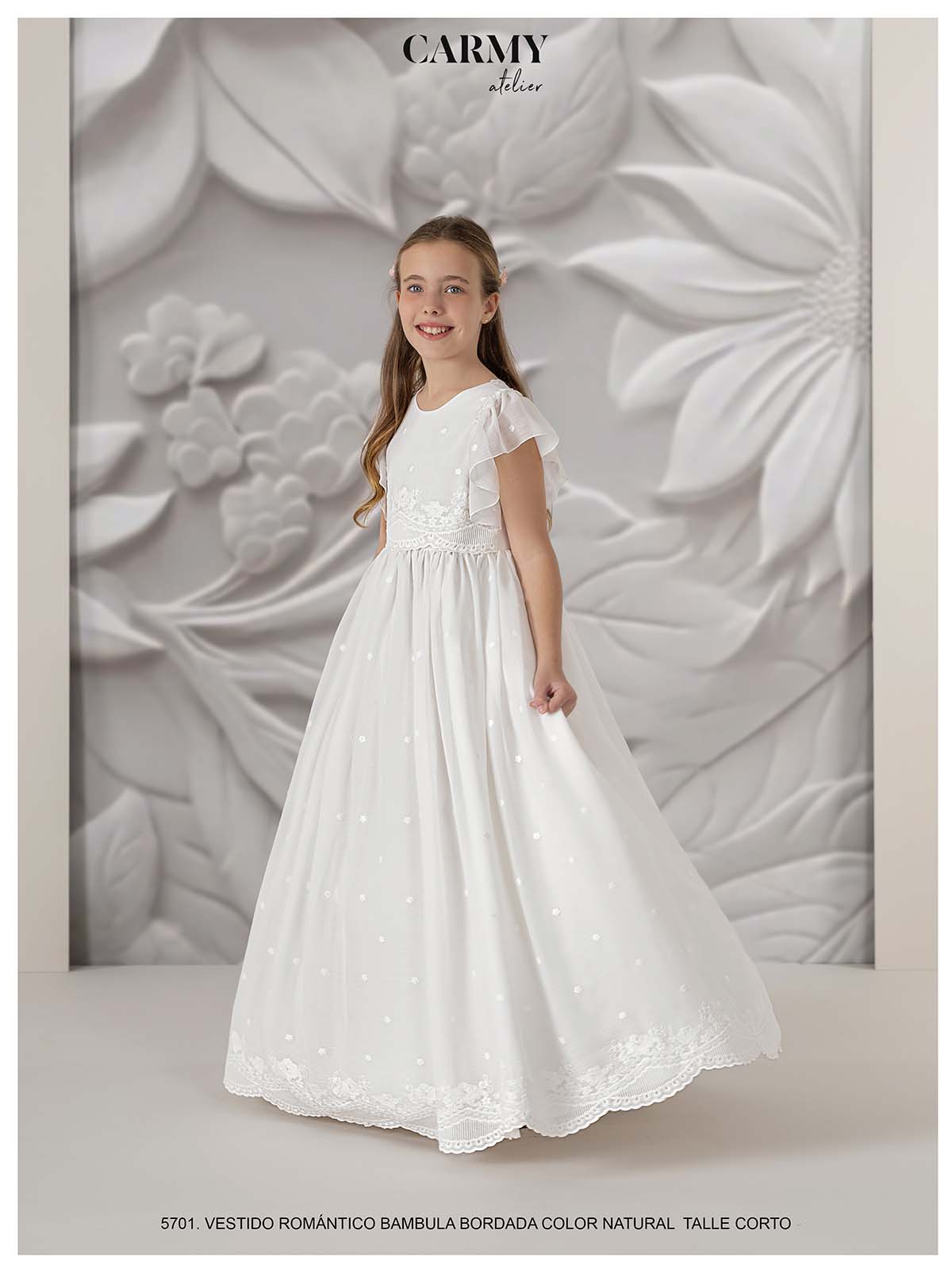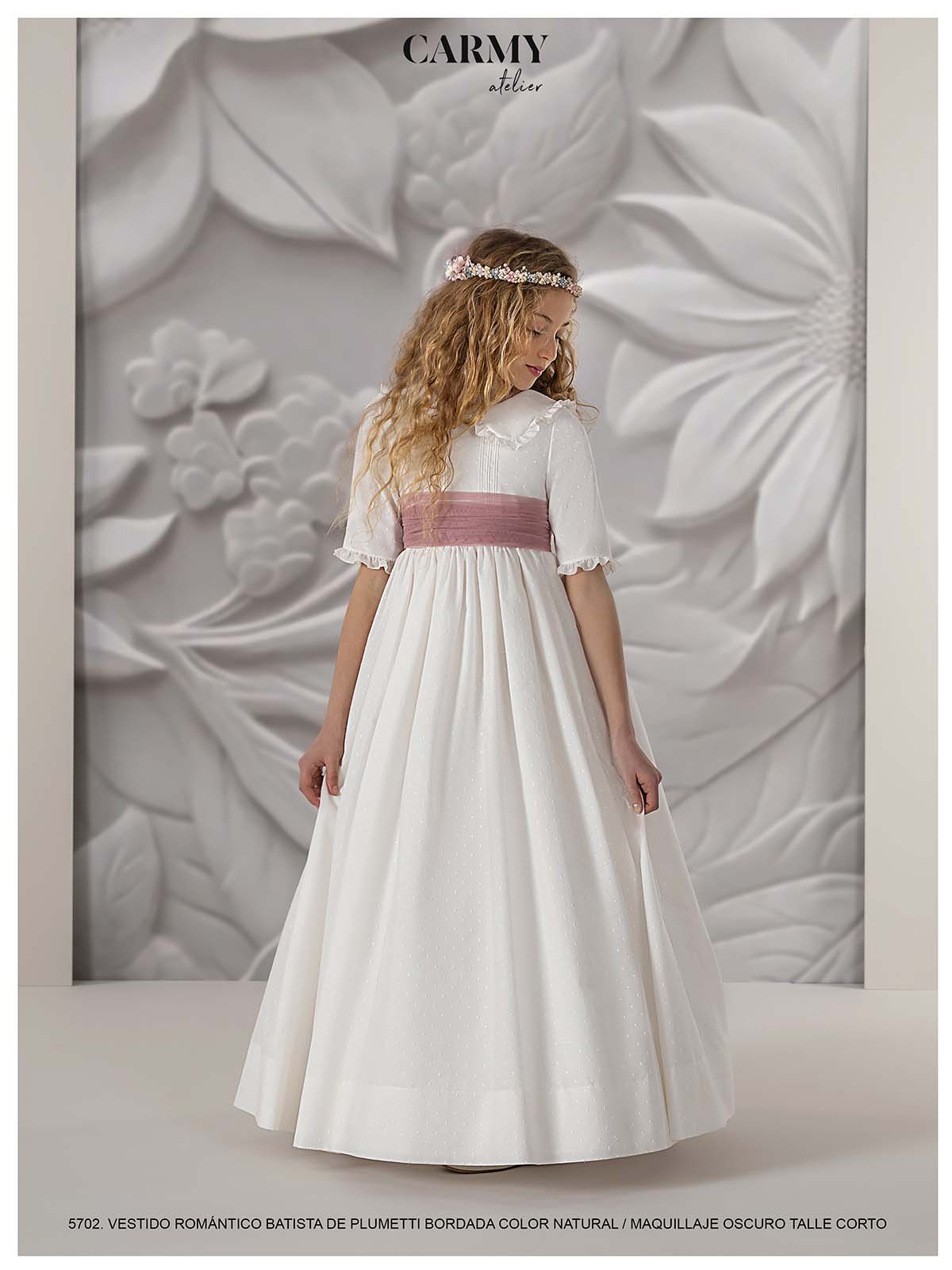Vestido de comunión romántico elaborado en batista de plumetti bordada. Los colores natural y maquillaje oscuro crean un contraste encantador y sofisticado. Este vestido de talle corto es perfecto para niñas que buscan un diseño único y elegante. Los detalles bordados y la calidad del tejido aseguran una prenda cómoda y hermosa, ideal para destacar en una ocasión tan especial como la comunión.