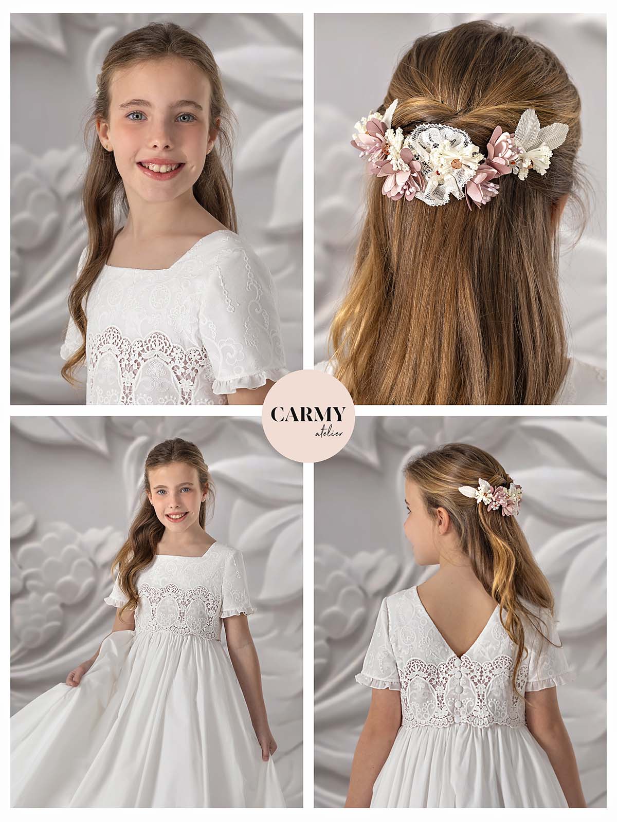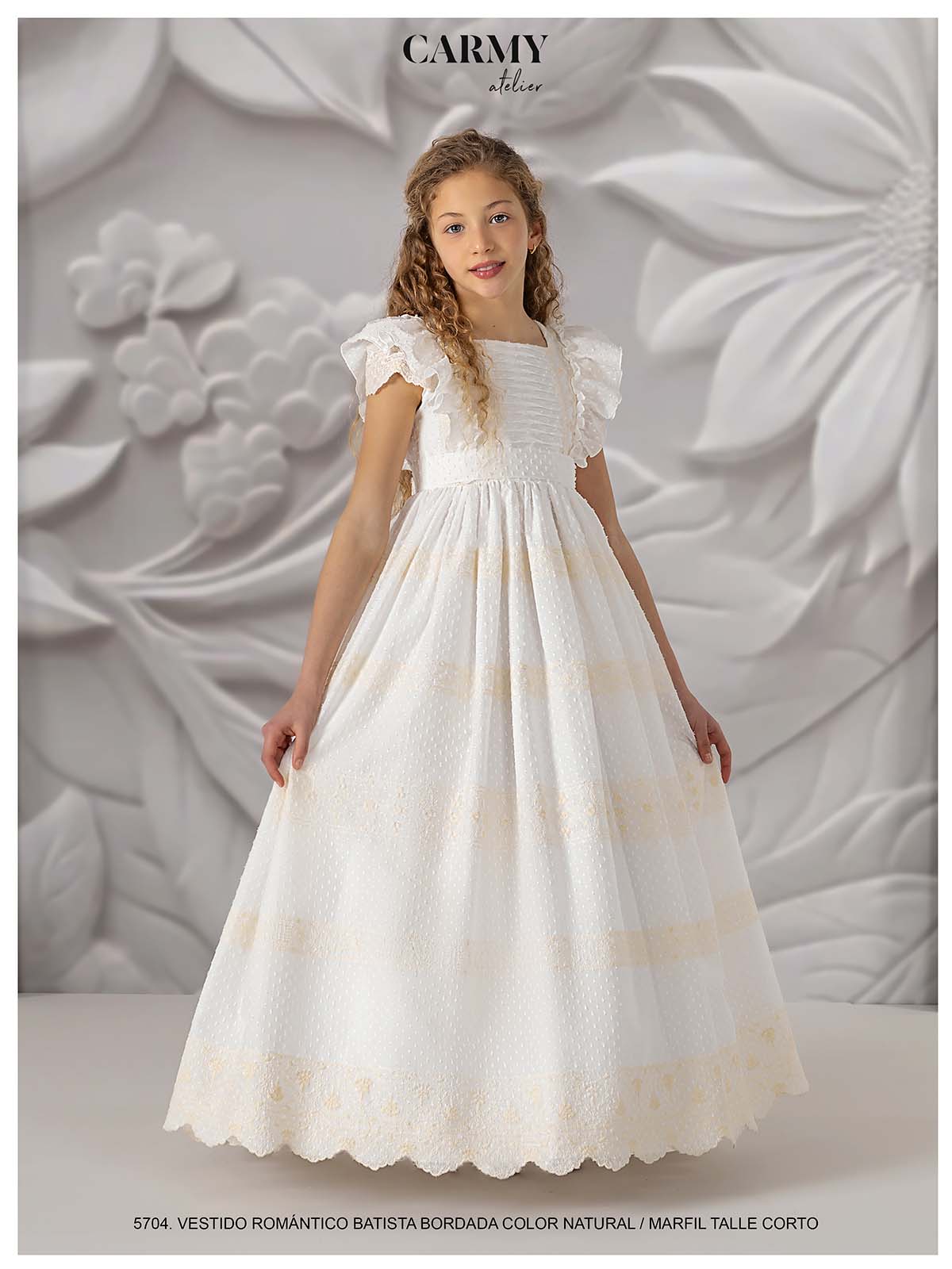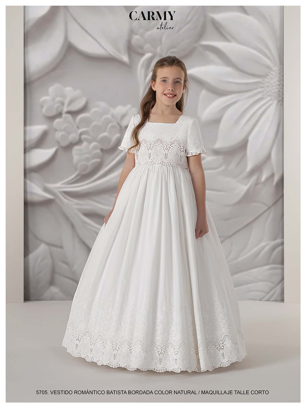 Vestido de comunión romántico confeccionado en batista bordada. La combinación de colores natural y maquillaje aporta una apariencia dulce y sofisticada. Con un talle corto, este vestido es ideal para niñas que desean un look moderno y elegante. La calidad de la batista y los detalles bordados aseguran una prenda cómoda y hermosa, perfecta para destacar en una ocasión tan especial como la comunión.