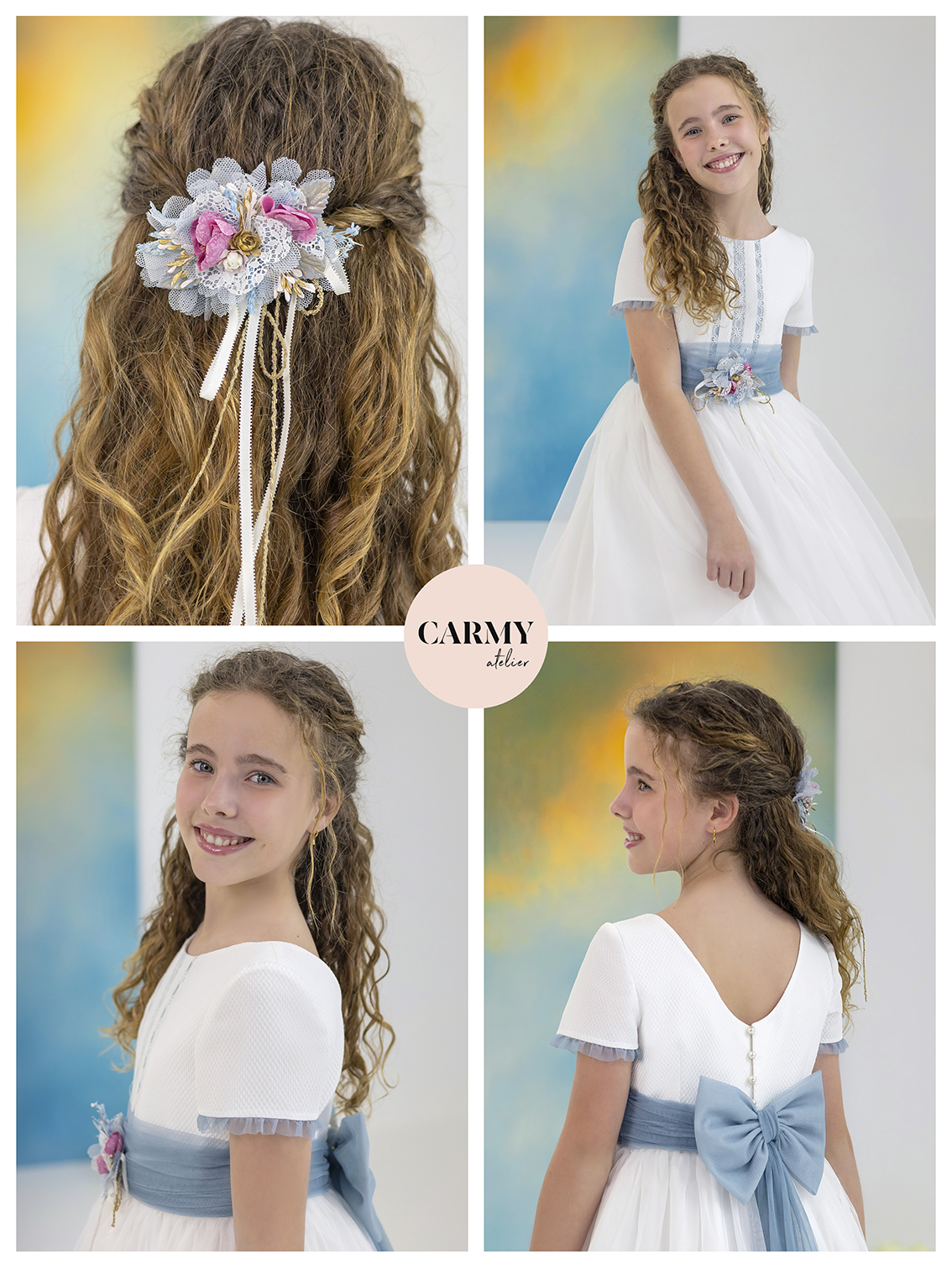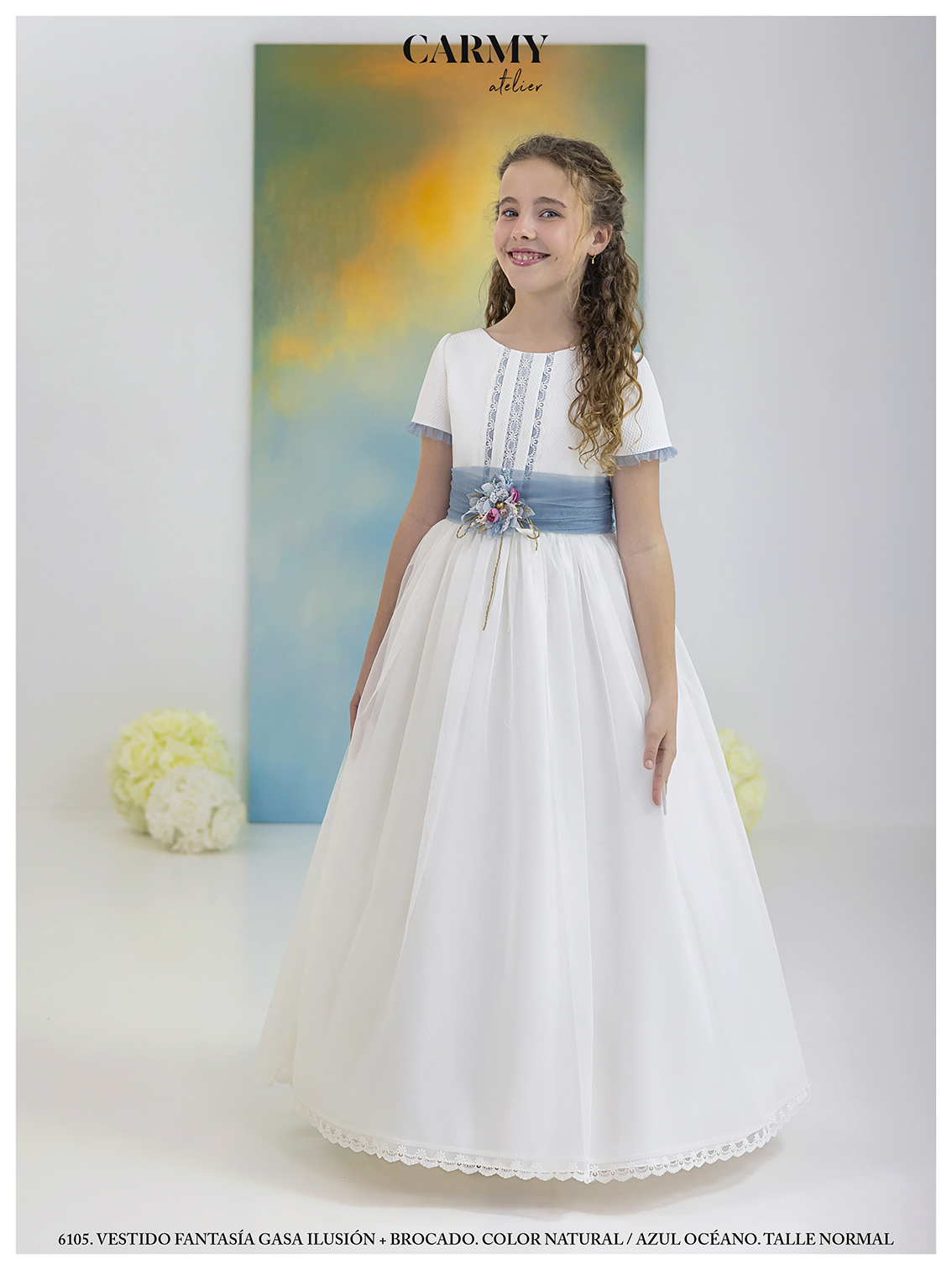 Vestido de comunión elaborado en gasa ilusión de color natural, combinado con tul azul océano. El cuerpo presenta escotes redondos y mangas cortas, brindando elegancia y comodidad. Destaca por su cinturón decorado con flores en la parte frontal y un lazo en la parte trasera, creando un conjunto delicado y encantador perfecto para la ocasión.