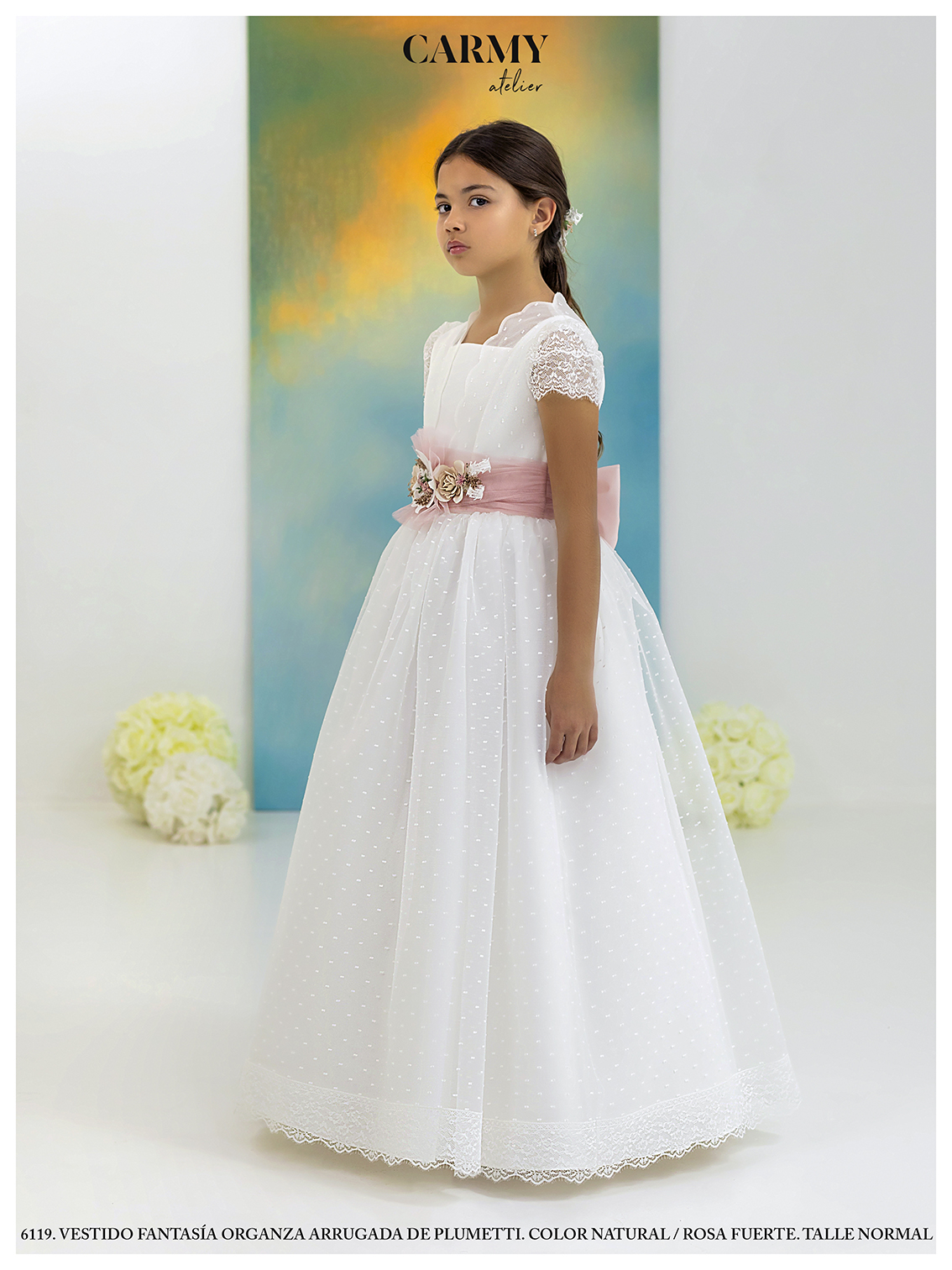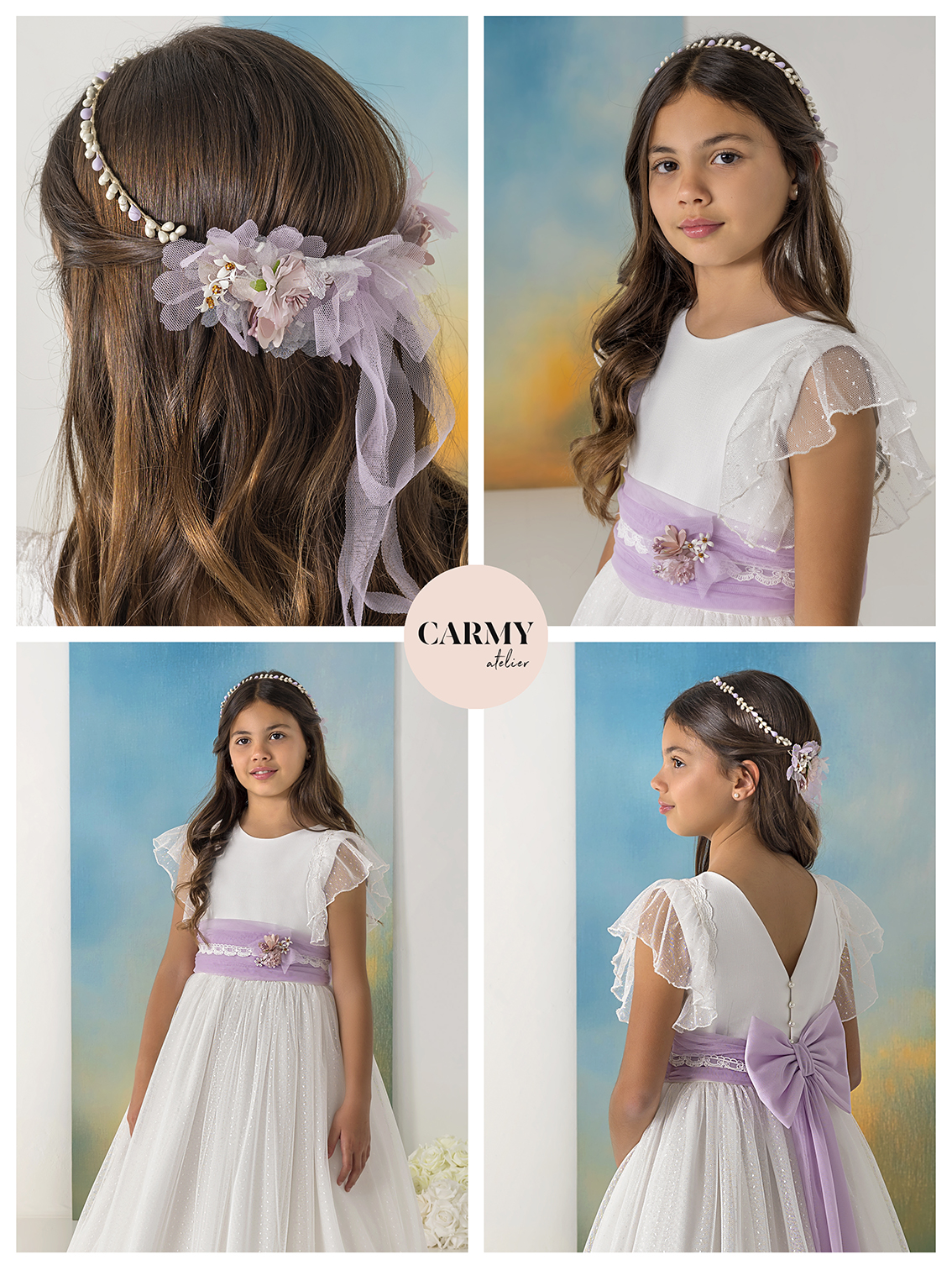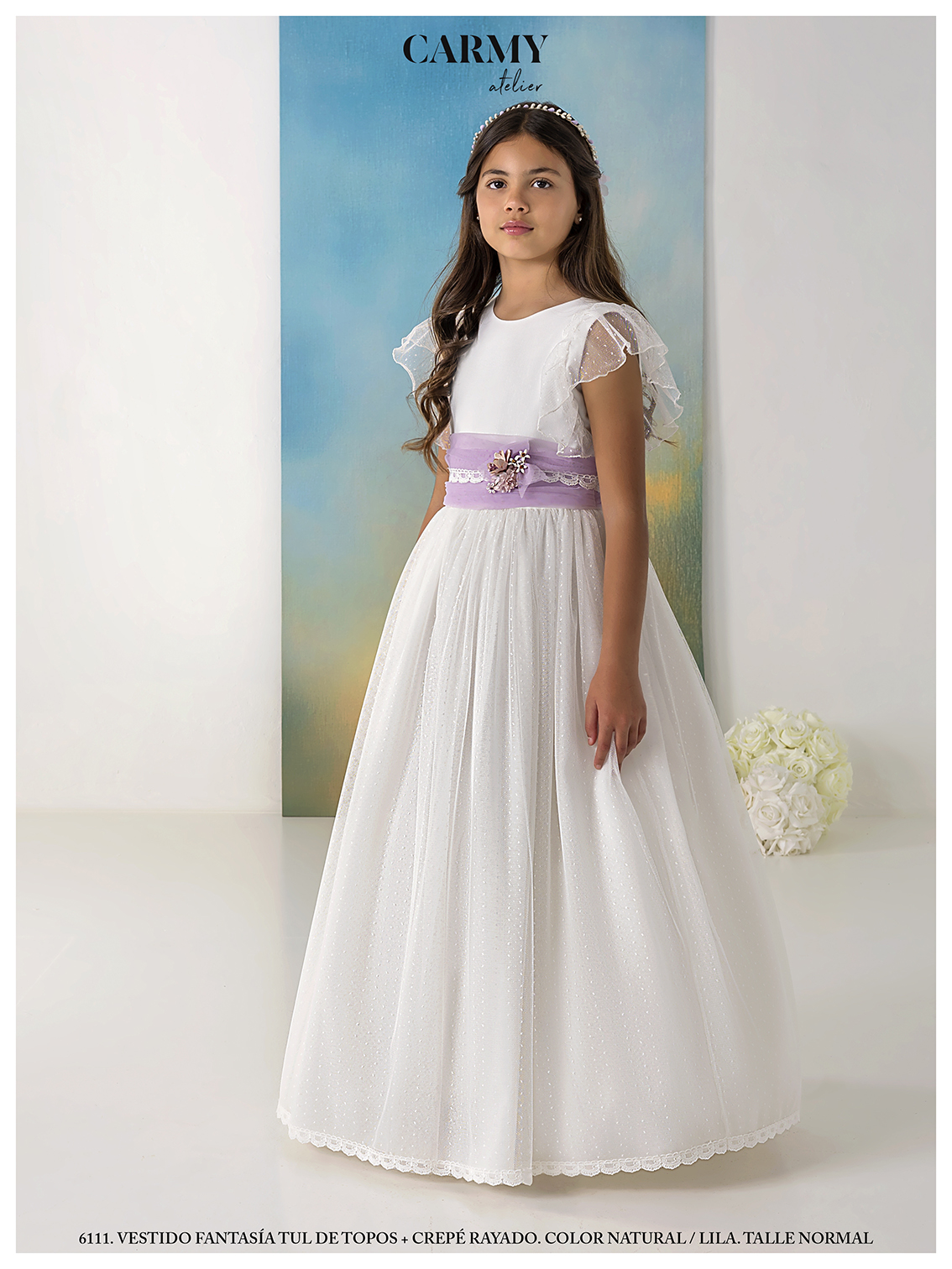 Vestido de comunión elaborado en tul de topos, que aporta un toque delicado y femenino. El cuerpo en crepe presenta un escote redondo en el delantero, mientras que la espalda en pico realza la elegancia. Incluye un cinturón en tul lila con puntilla y pequeño adorno de flores, y un lazo en la espalda que remata con dulzura.