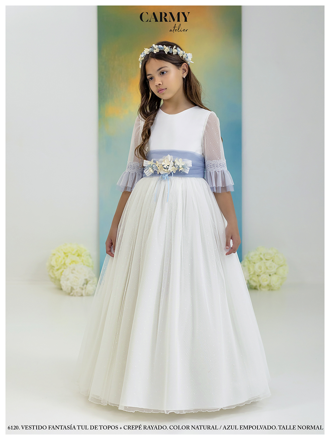 Este hermoso vestido de comunión está confeccionado en tul de topos color natural, con un cuerpo de escote redondo en el frente y espalda en pico adornada con puntilla. Tiene mangas largas hasta el codo con volante, y un cinturón de tul azul decorado con flores, añadiendo un toque especial. La espalda presenta un elegante lazo que complementa su diseño delicado y romántico, ideal para una ocasión especial.