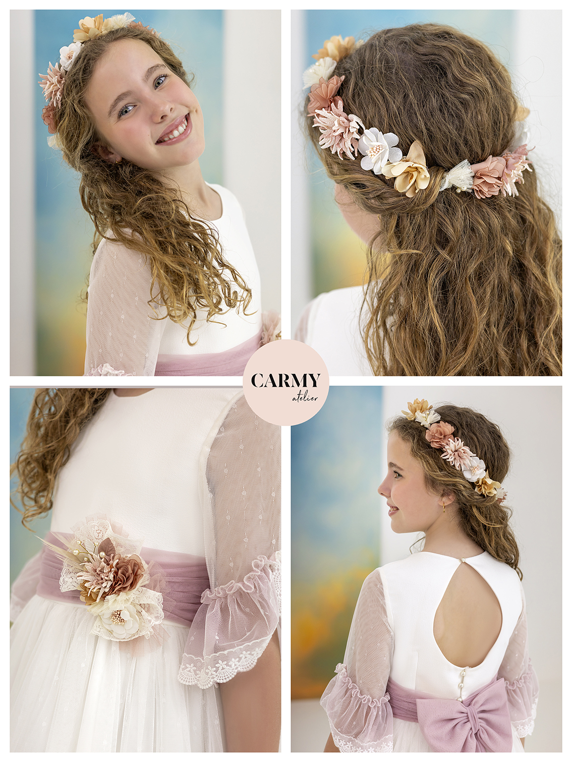Vestido de comunión elaborado en tul de topos, con espalda redondeada y mangas por debajo del codo que terminan en un volante elegante. Incluye un cinturón en tono maquillaje decorado con flores, y un lazo en la espalda que añade un toque delicado. Ideal para una ocasión especial, combina sencillez y sofisticación en un diseño encantador y romántico.