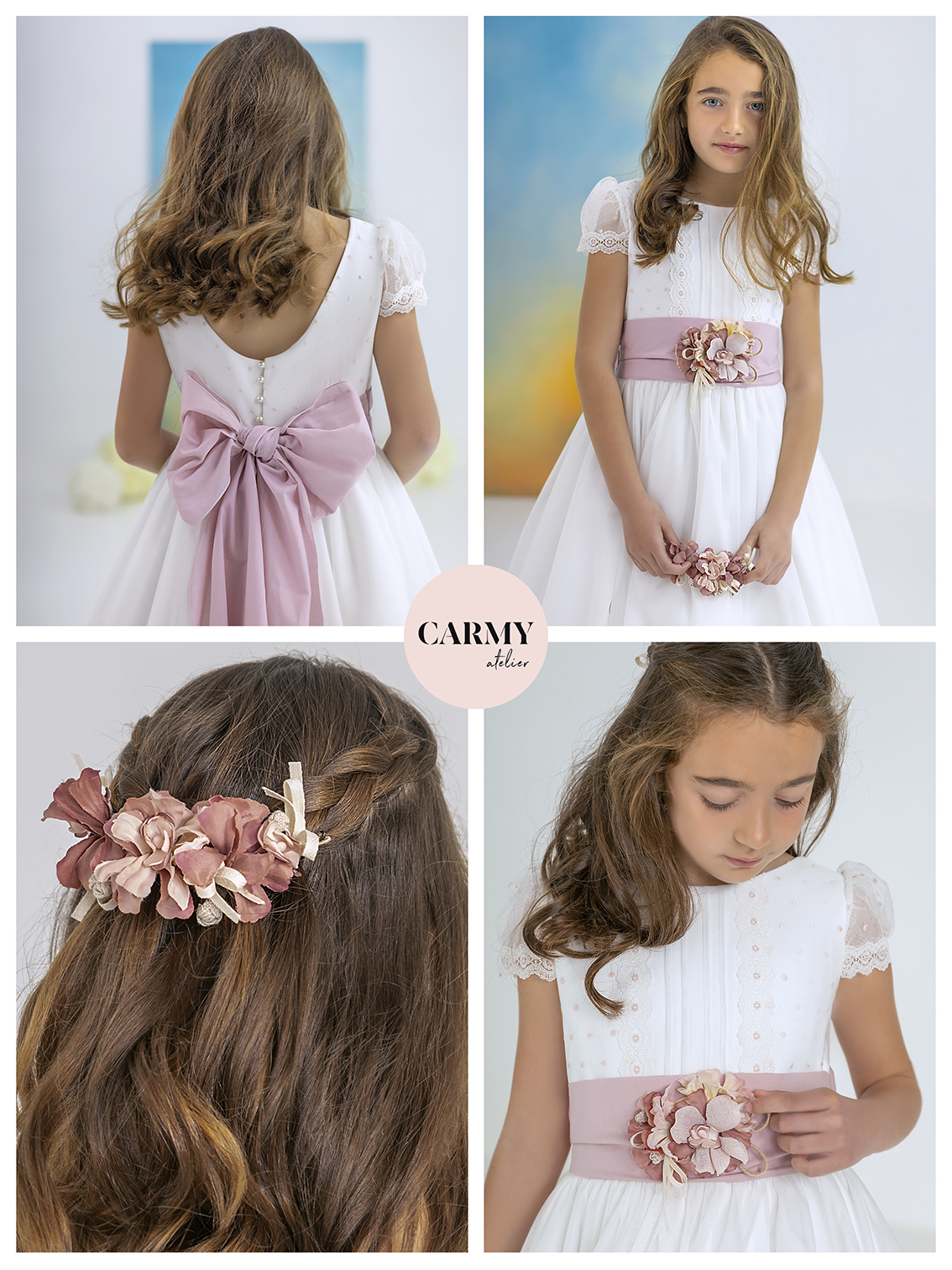 Vestido de comunión elaborado en tul de color natural, elegante y delicado. El cuerpo presenta un escote redondo que realza la figura, acompañando un tul adornado con bodoques en tono rosa que añade un toque romántico. Las mangas cortas están rematadas con puntilla, brindando delicadeza. Un cinturón rosa con un adorno de flores y una lazada en la espalda completan el diseño, haciendo de este vestido una elección encantadora y especial.