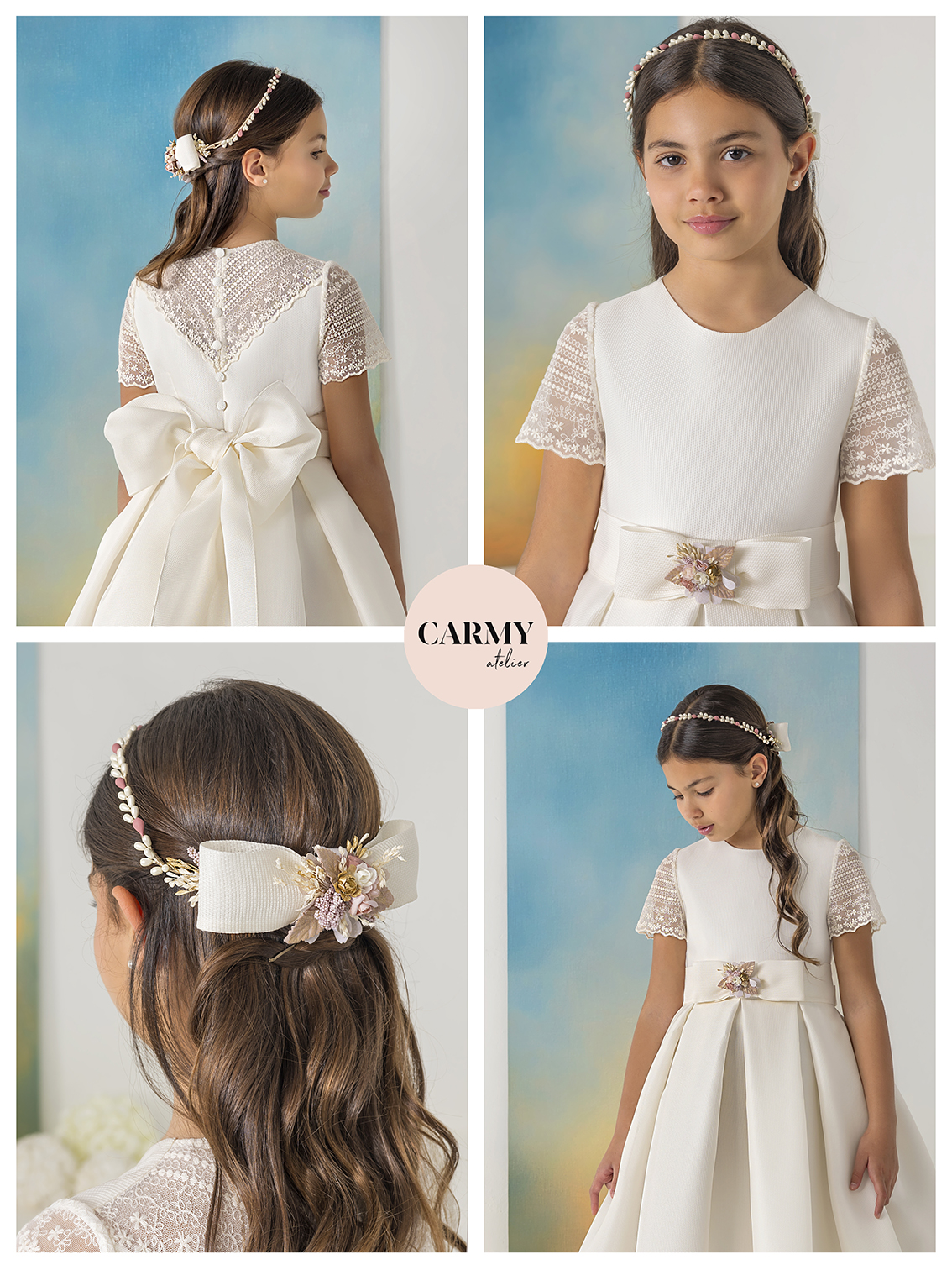 Vestido de comunión de estilo clásico, fabricado en esterilla de poliéster color marfil. Su cuerpo presenta un escote redondo en el delantero y una espalda transparente con delicado bordado. Las mangas cortas están bordadas, aportando elegancia. La falda, con tablas en la cintura, también lleva bordado, y está rematada con un cinturón adornado con flores y una lazada en la espalda, creando un conjunto armonioso y sofisticado.