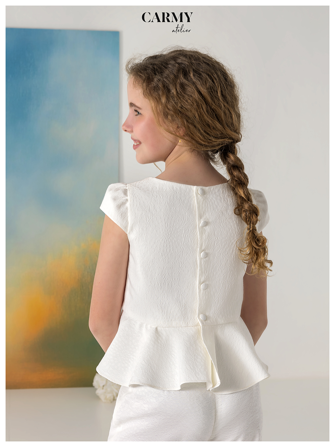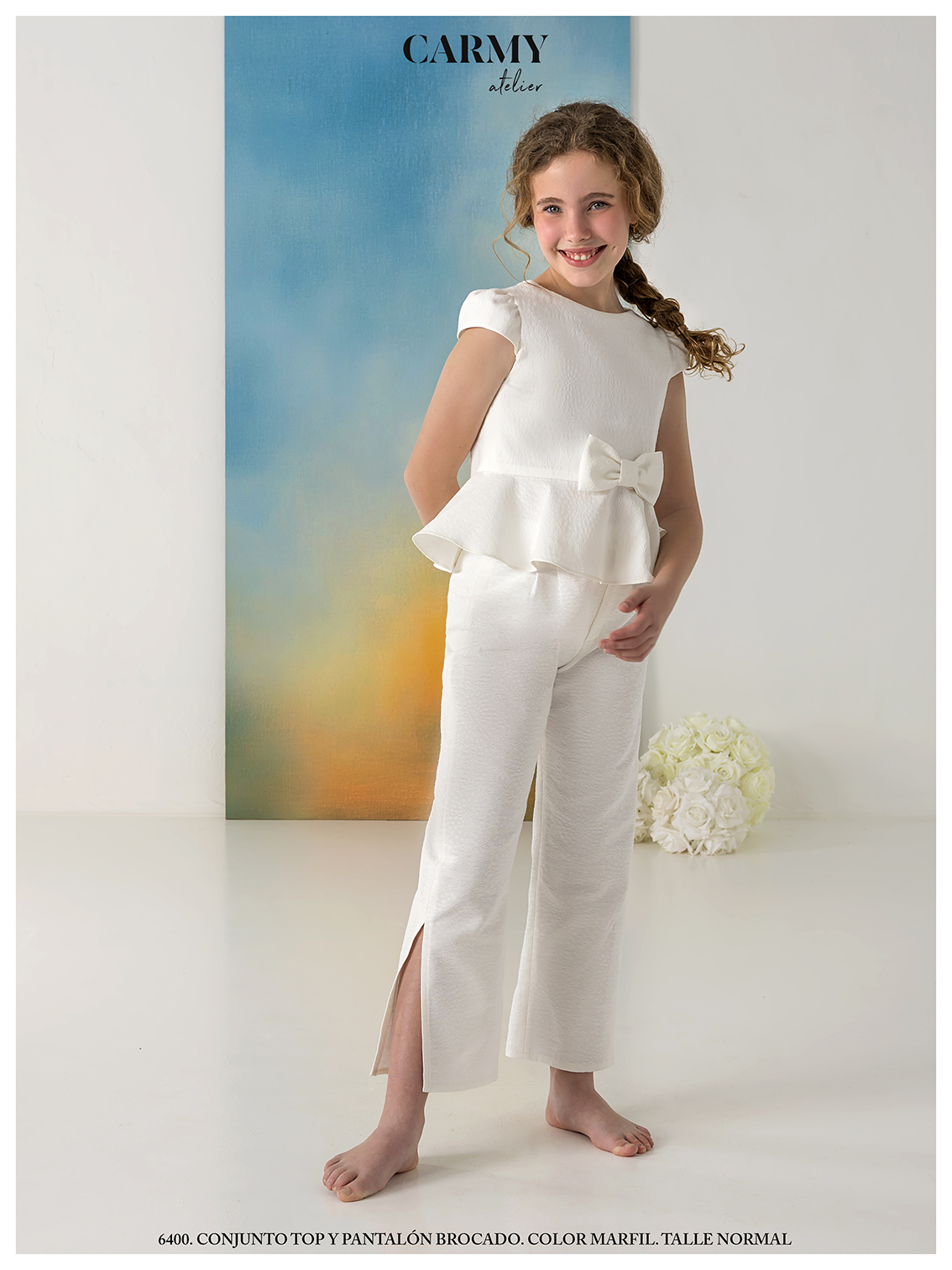 Conjunto de dos piezas para comunión, elaborado en elegante tejido brocado. La blusa destaca por su volante en la cintura y un lazo decorativo, aportando un toque delicado y sofisticado. El pantalón tobillero, con abertura en los laterales, combina comodidad y estilo, creando un conjunto perfecto para una ocasión especial. Ideal para lucir con gracia y elegancia.