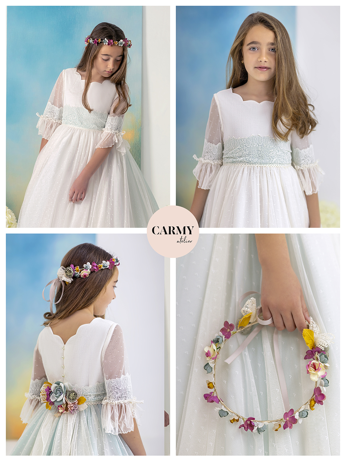 Vestido de comunión elaborado en tul marfil con delicados topos, combinado con tul verde que aporta un toque fresco y elegante. El cuerpo presenta un escote de ondas que realza la figura, mientras que la cintura está adornada con una delicada puntilla y un hermoso adorno de flores en la espalda. La falda cuenta con una abertura trasera, añadiendo un toque de sofisticación y comodidad para la niña en su día especial.