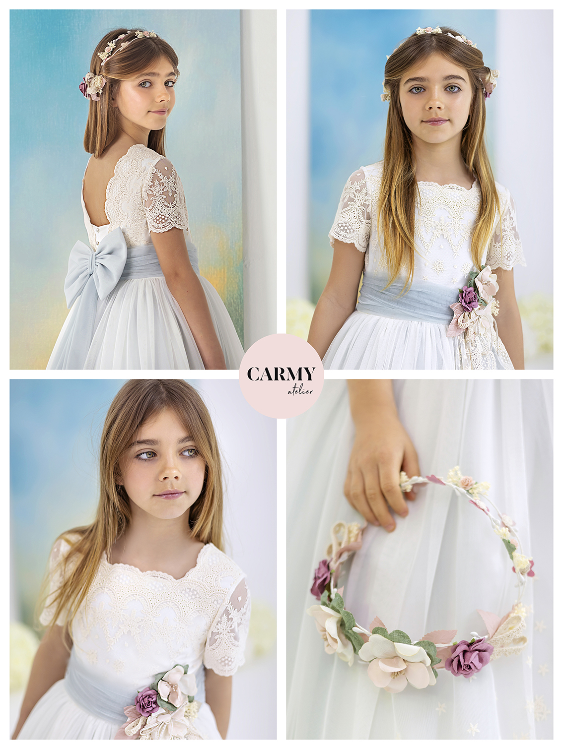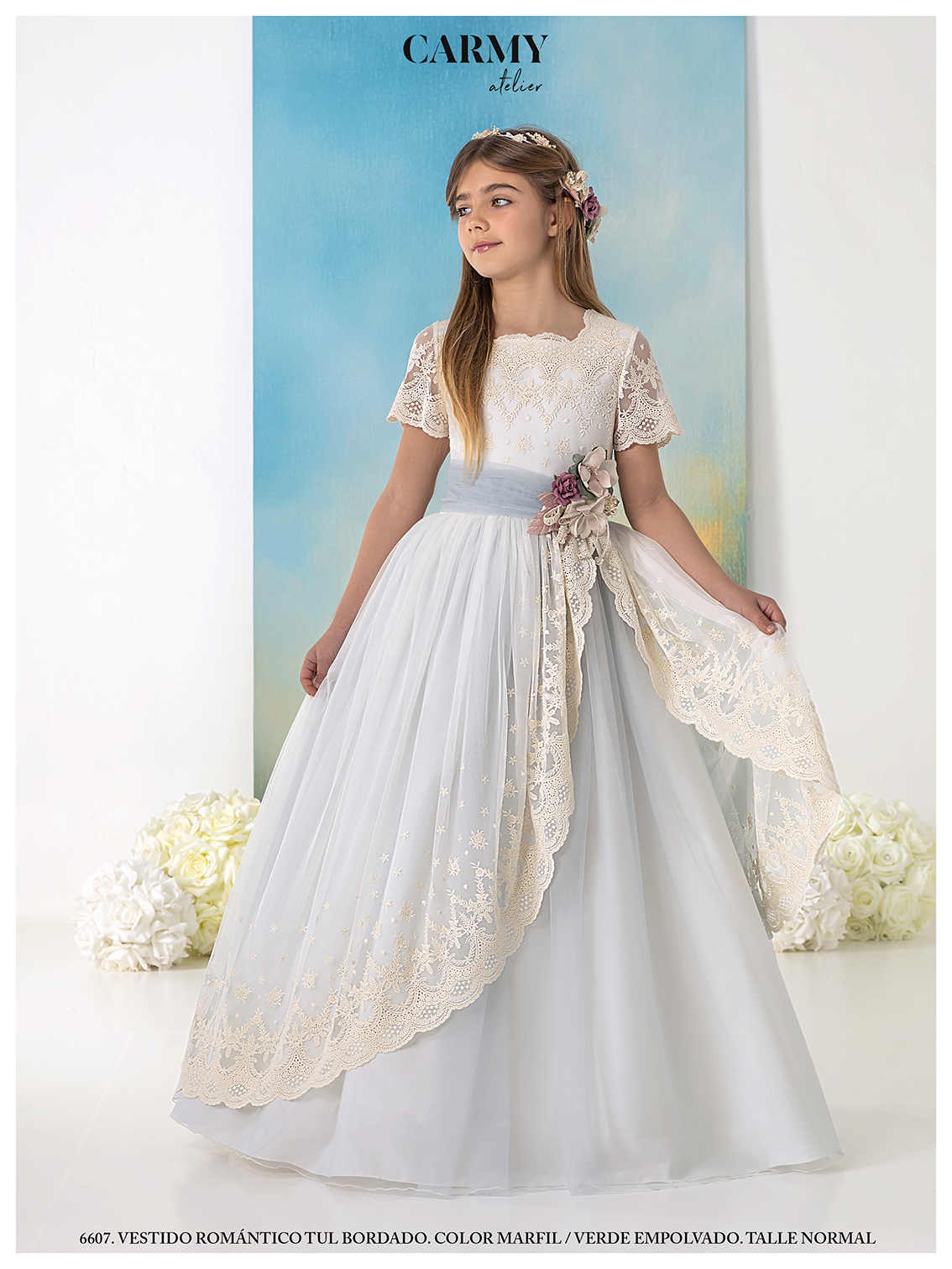 Vestido de comunión en marfil, confeccionado en tul bordado delicado, con detalles en tul verde que aportan un toque fresco y elegante. El cuerpo cuenta con un escote cuadrado y mangas cortas, adornados con bordados finos. La falda bordada presenta una abertura lateral que añade movimiento y estilo. Un cinturón verde con flores y un lazo trasero complementan perfectamente el conjunto, creando un look encantador y sofisticado.