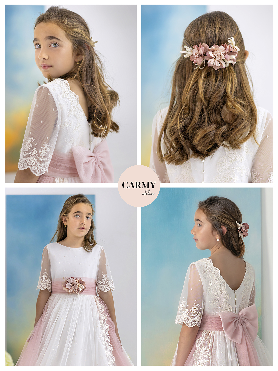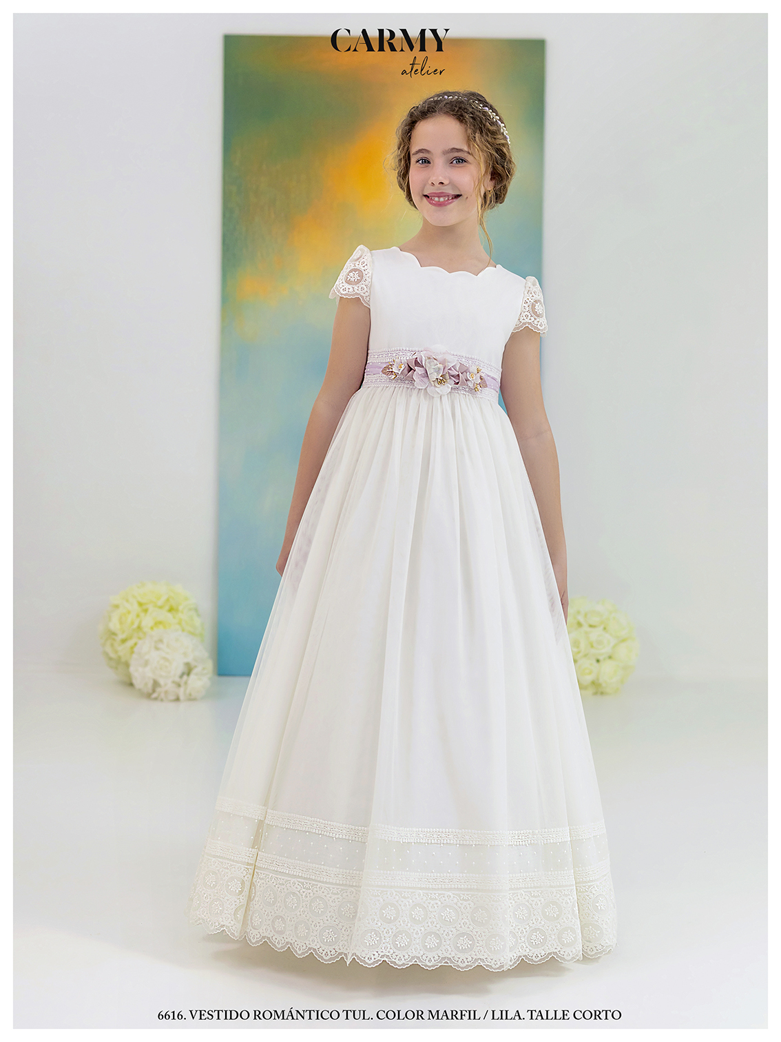 Vestido de comunión en tul marfil con delicado bordado, combinado con tul rosa para un toque romántico. El cuerpo presenta escote redondo y detalles bordados elegantes. Incluye un cinturón de tul rosa adornado con flores y un lazo en la parte trasera, añadiendo encanto. La falda bordada tiene aberturas laterales que aportan un estilo sofisticado y cómodo. Ideal para una ocasión especial, combina dulzura y elegancia en cada detalle.