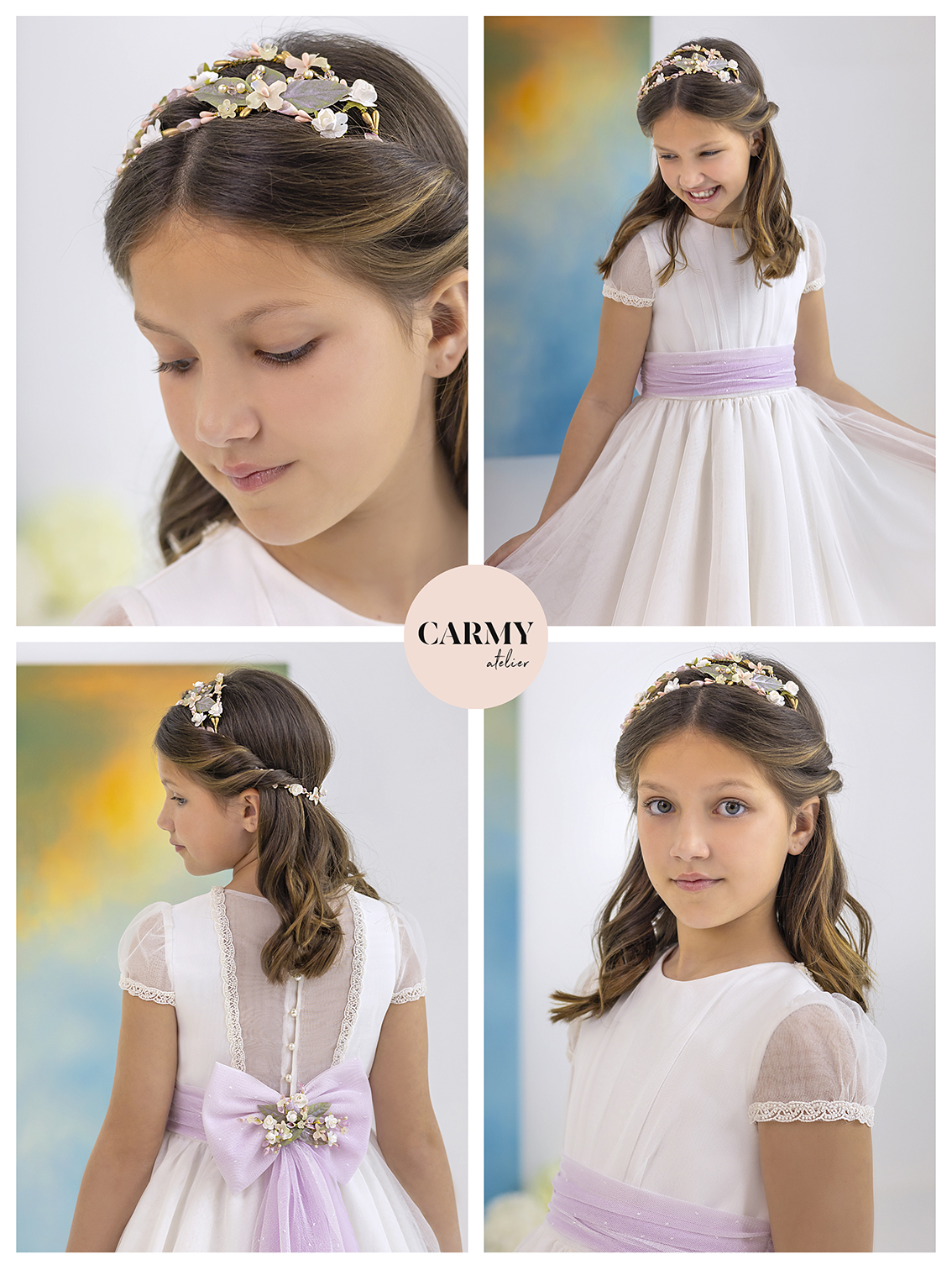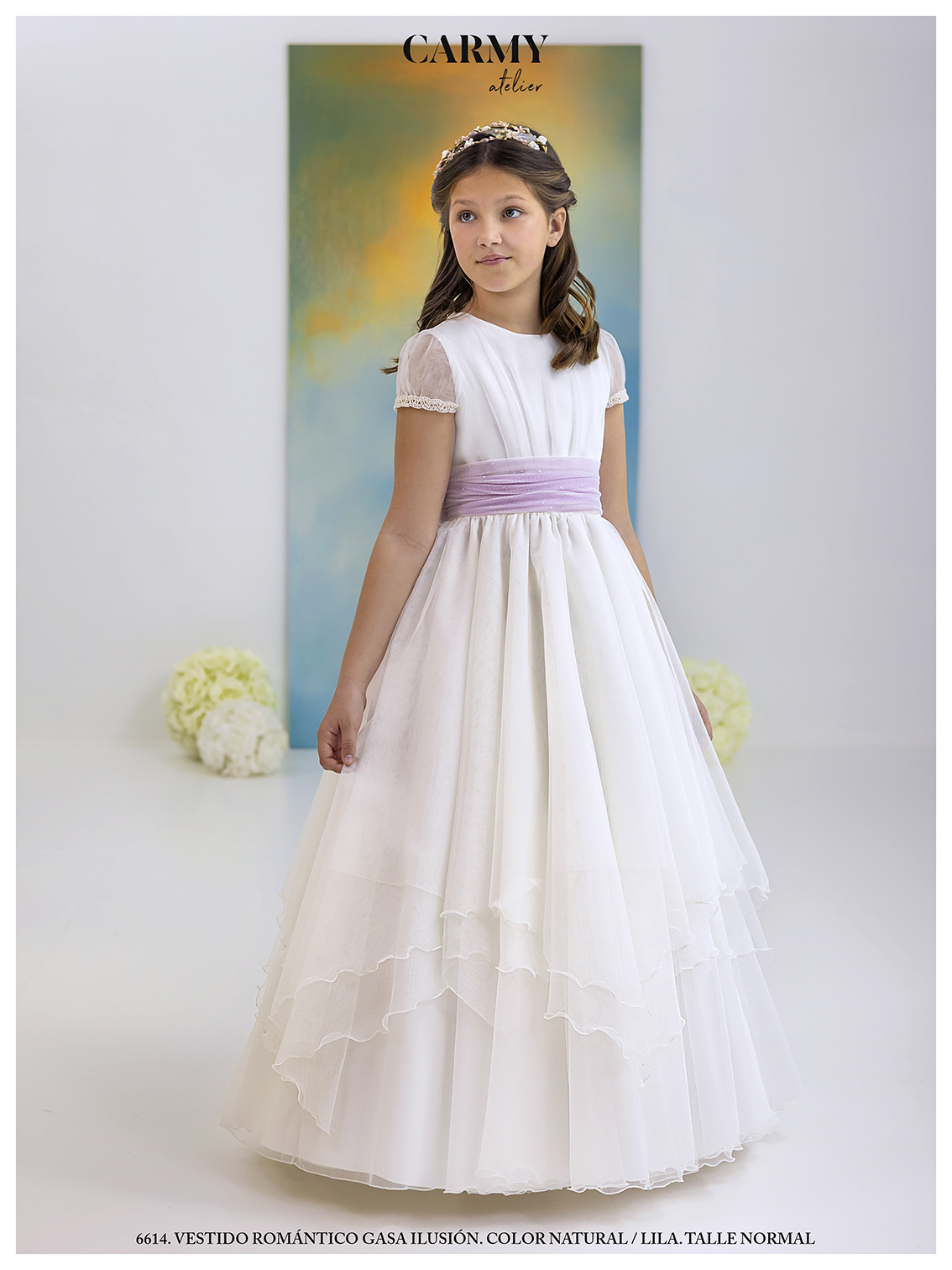 Vestido de comunión en gasa ilusión color natural, elegante y delicado. El cuerpo presenta un escote redondo y espalda transparente, acompañado de mangas cortas. La falda de varias capas en picos aporta volumen y movimiento. Un cinturón de tul lila con topos, adornado con un hermoso lazo en la espalda y flores, añade un toque romántico y sofisticado, ideal para una ocasión especial.