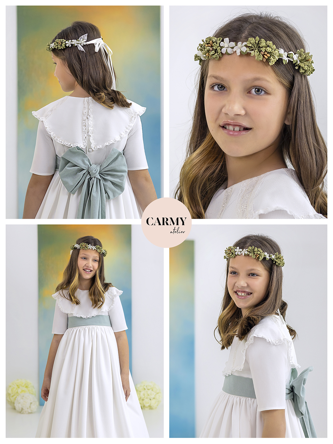 Vestido de comunión fabricado en crepe de color natural, elegante y sencillo. El cuerpo presenta una baberola adornada con delicadas puntillas, aportando un toque clásico y romántico. Sus mangas son lisas, aportando sobriedad y comodidad. La cintura está resaltada por un cinturón verde con una lazada en la parte trasera, que añade un toque de color y sofisticación al conjunto, ideal para una ocasión especial y memorable.