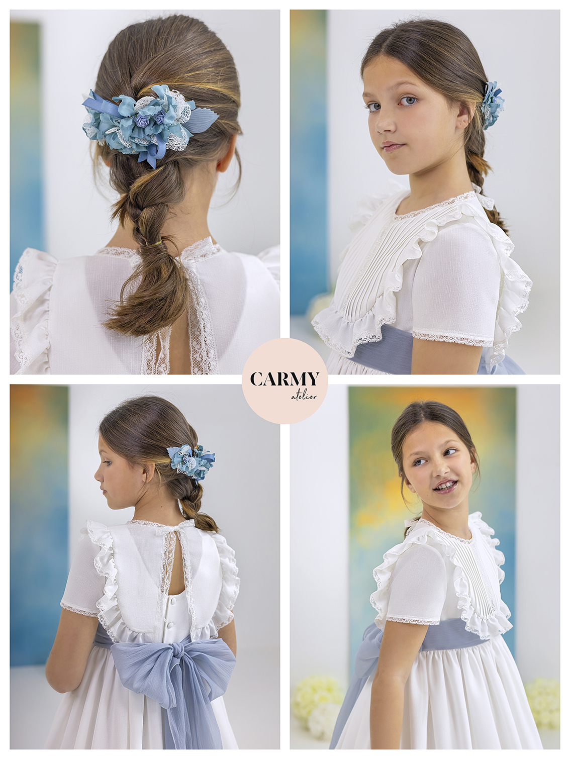 Vestido de comunión fabricado en crepe color natural, elegante y sencillo. El cuerpo destaca por una baberola con jaretas y puntilla, aportando delicadeza. Sus mangas cortas lisas llevan puntilla en el puño, añadiendo un toque refinado. Incluye un cinturón azul con lazada en la parte trasera, que realza la figura y aporta un contraste bonito. Ideal para una ocasión especial, combinando sencillez y sofisticación con delicadeza.