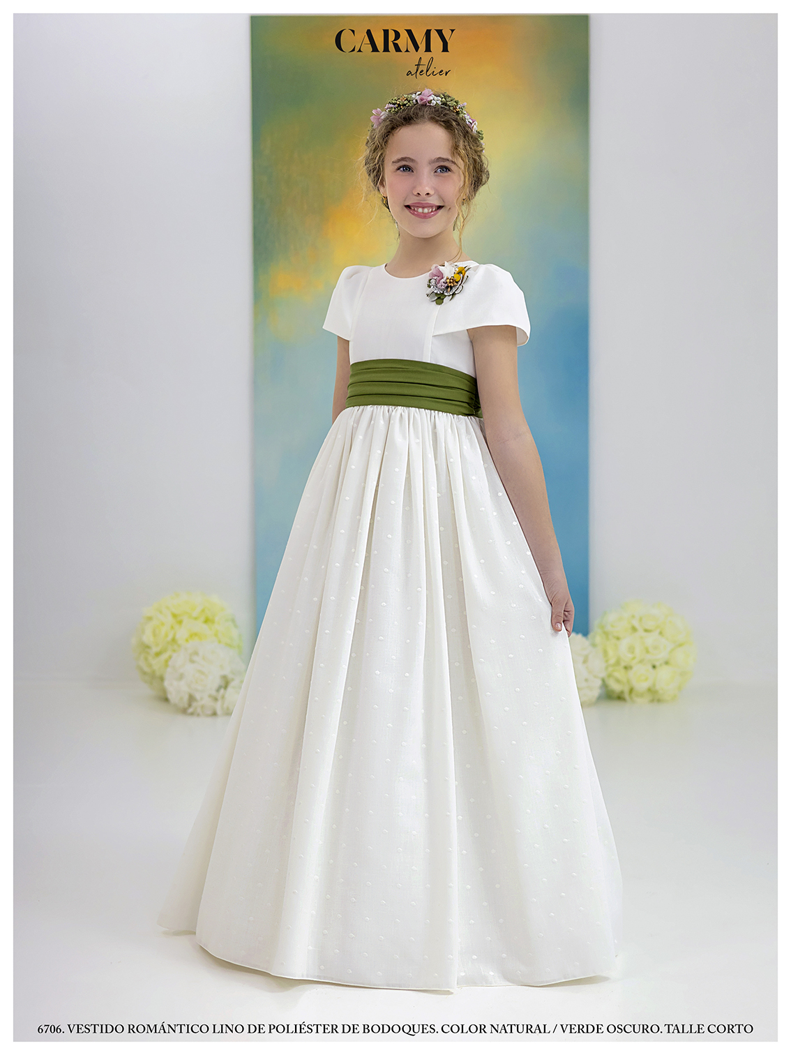 Vestido de comunión elaborado en lino, con bodoques bordados en color natural que aportan elegancia artesanal. Su cuerpo presenta un escote redondo y mangas cortas, adornado con un delicado adorno de flores en el hombro, añadiendo un toque romántico. Incluye un cinturón en tono verde oliva con un lazo en la parte trasera, complementando perfectamente el diseño sencillo y sofisticado, ideal para una ocasión especial.