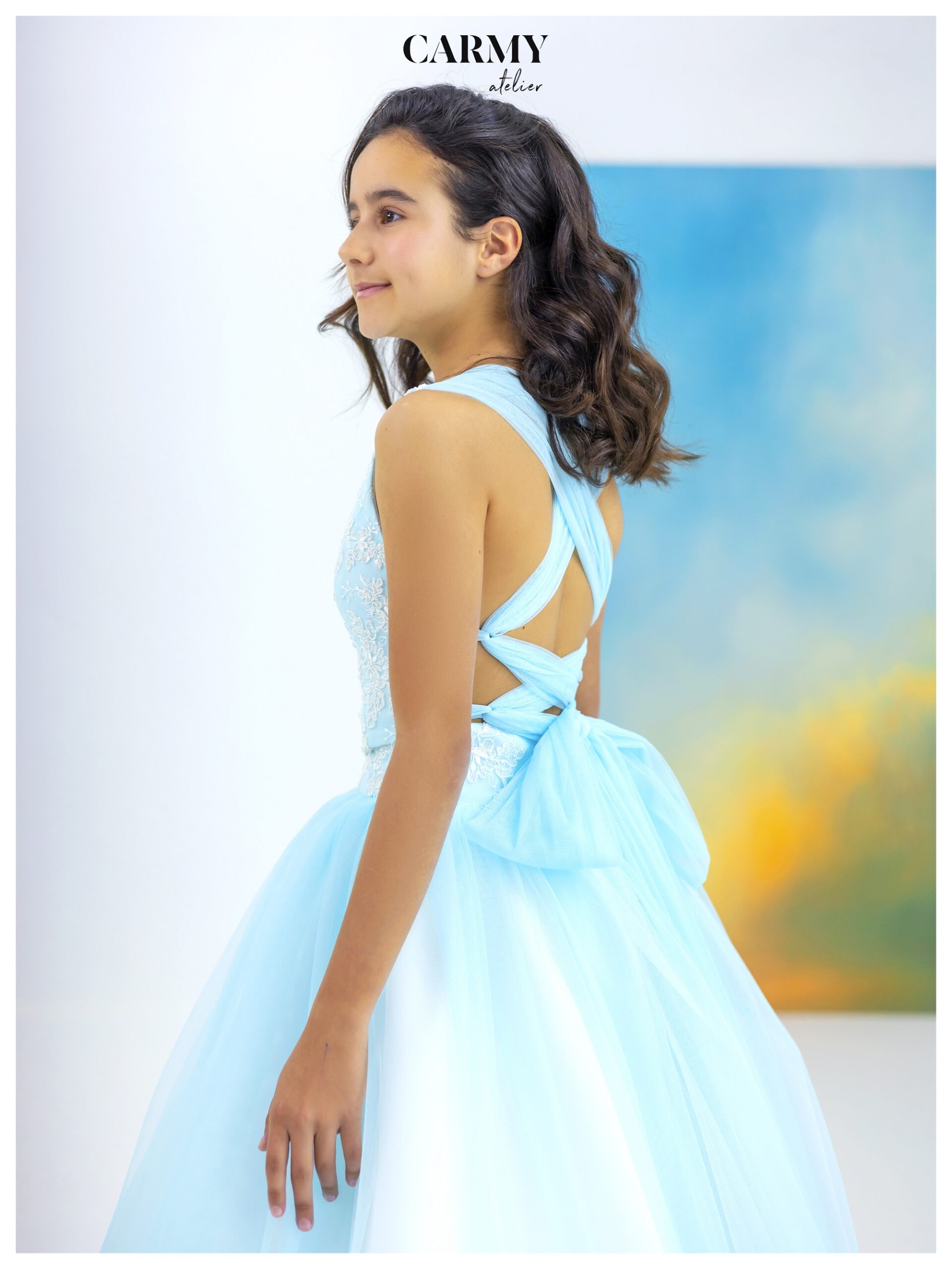 Vestido para reina y damas de fiesta en tul azul turquesa, compuesto por dos piezas elegantes. El cuerpo presenta un delicado tul bordado, con una espalda cruzada que realza la figura. La falda, con abundante volumen, aporta majestuosidad y movimiento, mientras que la cinturilla bordada añade un toque de sofisticación. Ideal para ocasiones especiales, este conjunto combina belleza y estilo en un diseño sofisticado y llamativo.